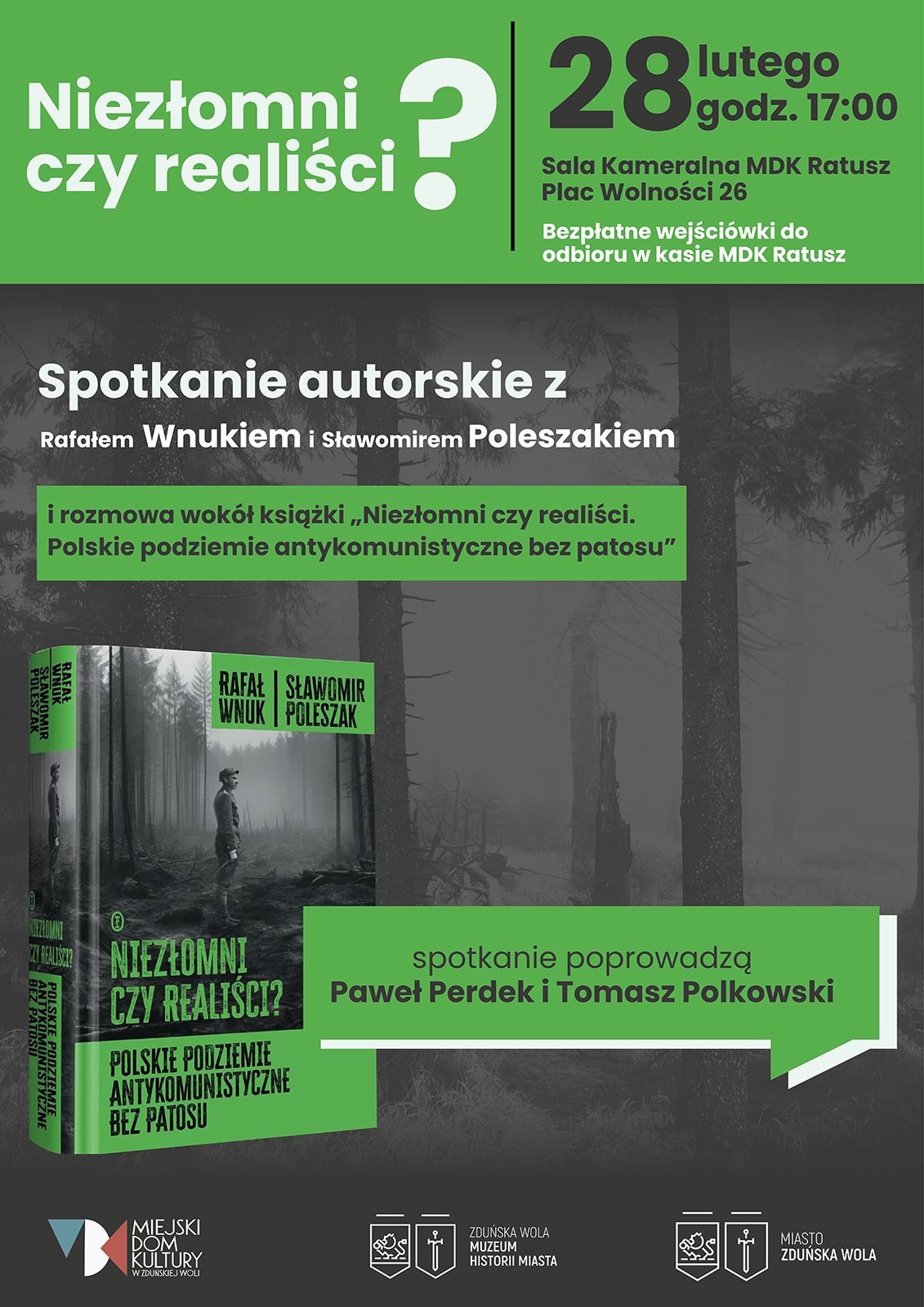 Miejski Dom Kultury Ratusz i Muzeum Historii Miasta Zduńska Wola zapraszają na spotkanie poświęcone książce Rafała Wnuka i Sławomira Poleszaka „Niezłomni czy realiści. Polskie podziemie antykomunistyczne bez patosu”. Rozmowę z autorami poprowadzą Paweł Perdek i Tomasz Polkowski.