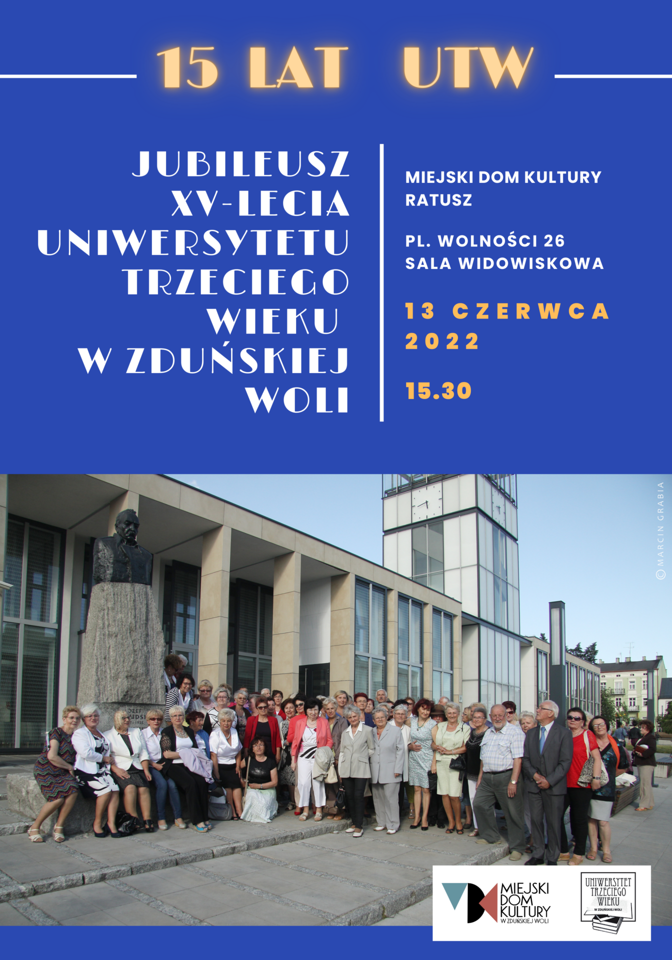 Jubileusz 15-lecia istnienia Uniwersytetu Trzeciego Wieku odbędzie się 13 czerwca (poniedziałek), o godz. 15.30 w sali widowiskowej Miejskiego Domu Kultury Ratusz, pl. Wolności 26.