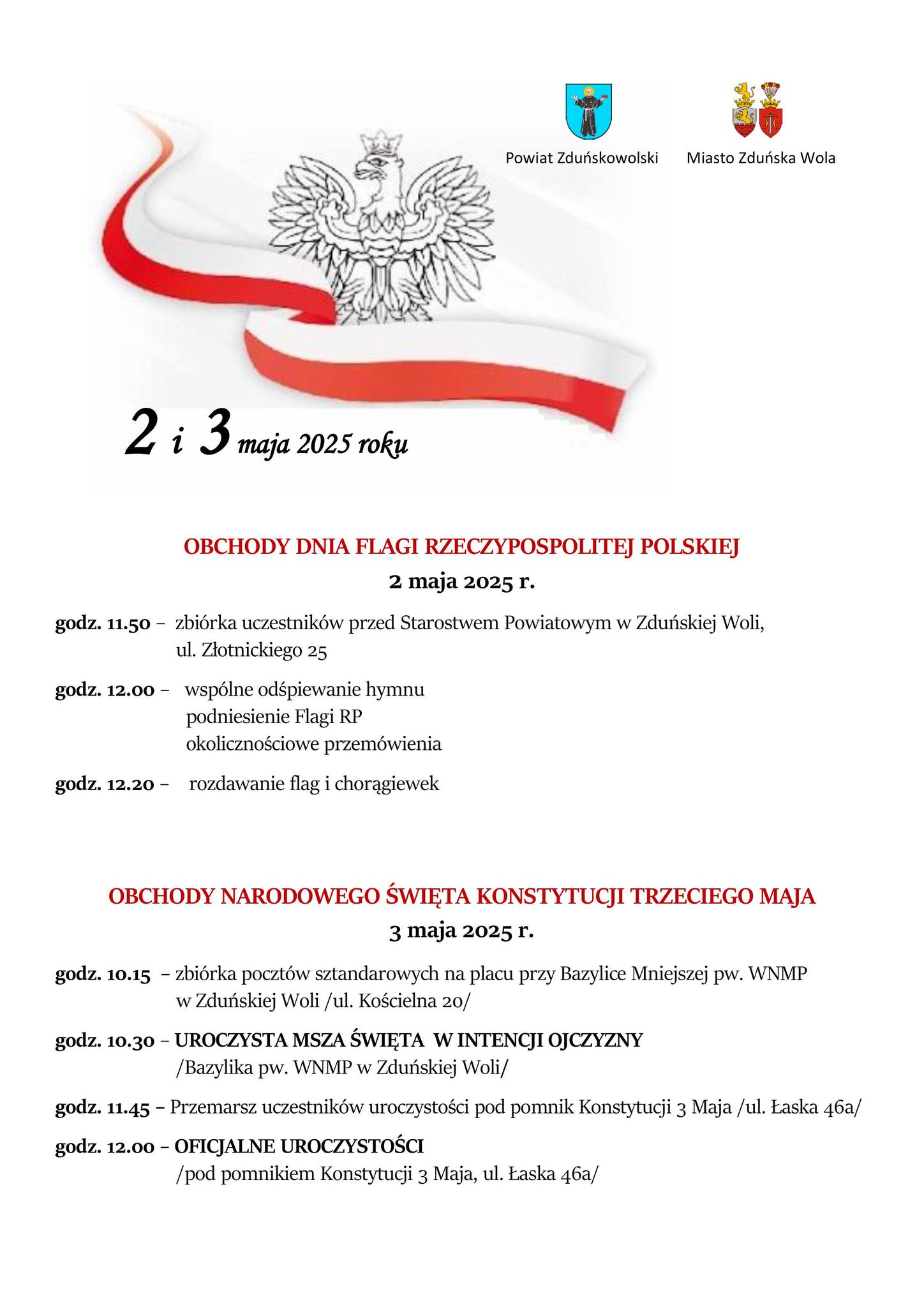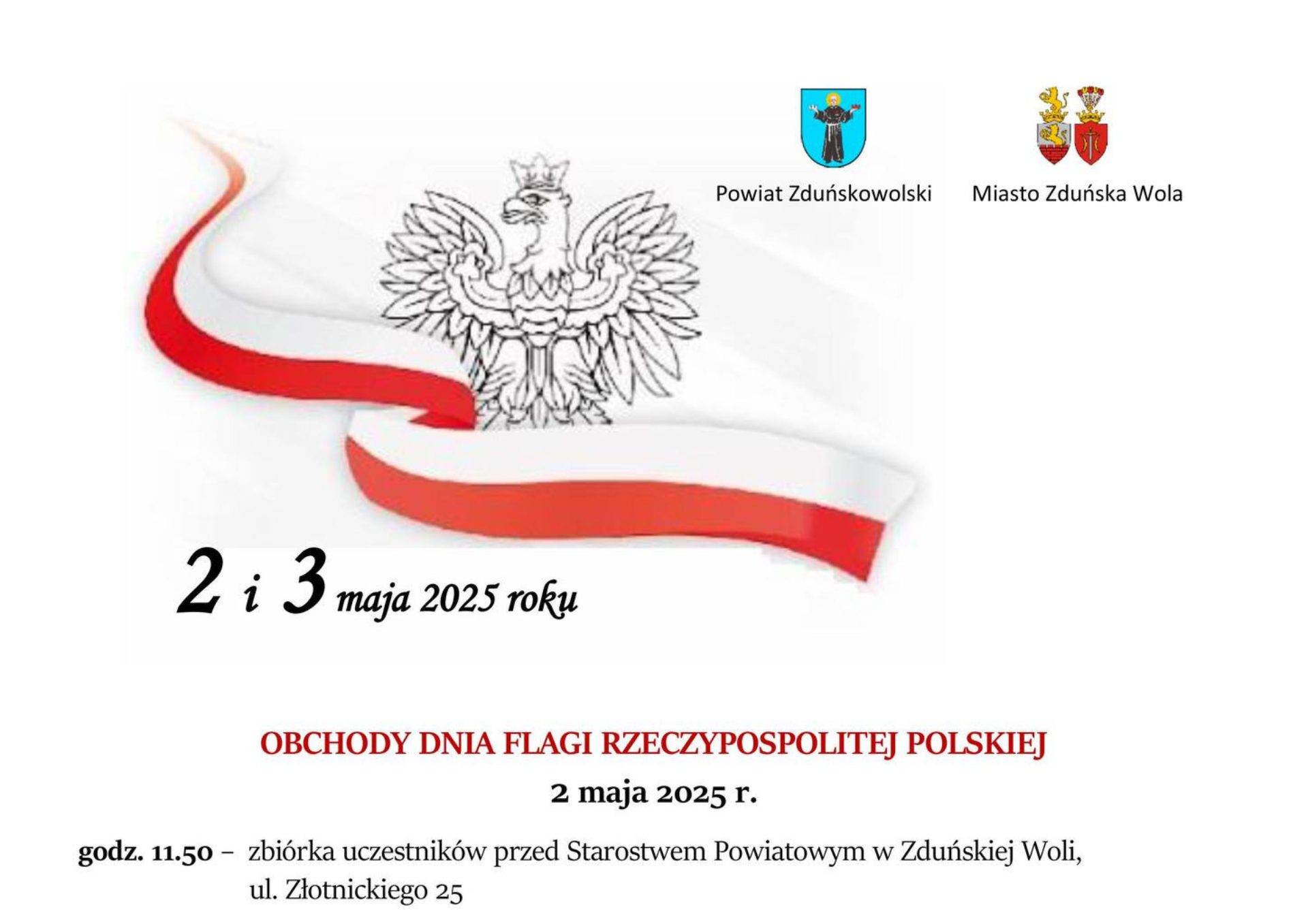 Obchody uroczystości majowych rozpoczną się 2 maja. W Dniu Flagi RP zapraszamy Was przed Starostwo Powiatowe w Zduńskiej Woli, ul. Złotnickiego 25.