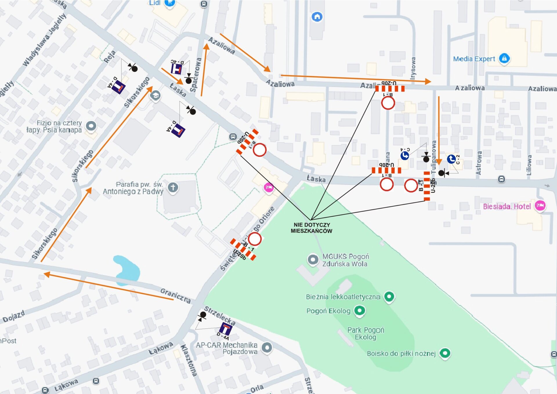 Czasowa organizacja ruchu związana jest także z zamknięciem części ul. Świętego Alojzego Orione od wjazdu na parking przy Parafii pw. św. Antoniego z Padwy do skrzyżowania z ulicą Łaską oraz z zamknięciem ul. Łaskiej od wjazdu na parking Parafii pw. św. Antoniego z Padwy do skrzyżowania z ulicą Tulipanową.