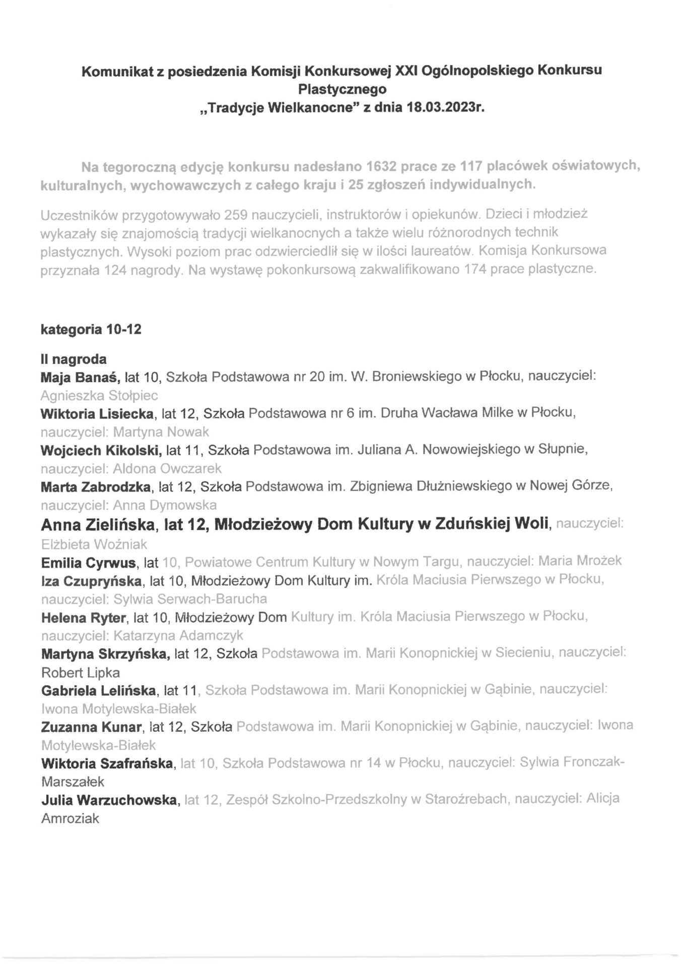 Na tegoroczną edycję nadesłano 1632. prace plastyczne ze 117. placówek oświatowych, kulturalnych i wychowawczych z całego kraju oraz 25. zgłoszeń indywidualnych. Komisja Konkursowa przyznała 124. nagrody.
