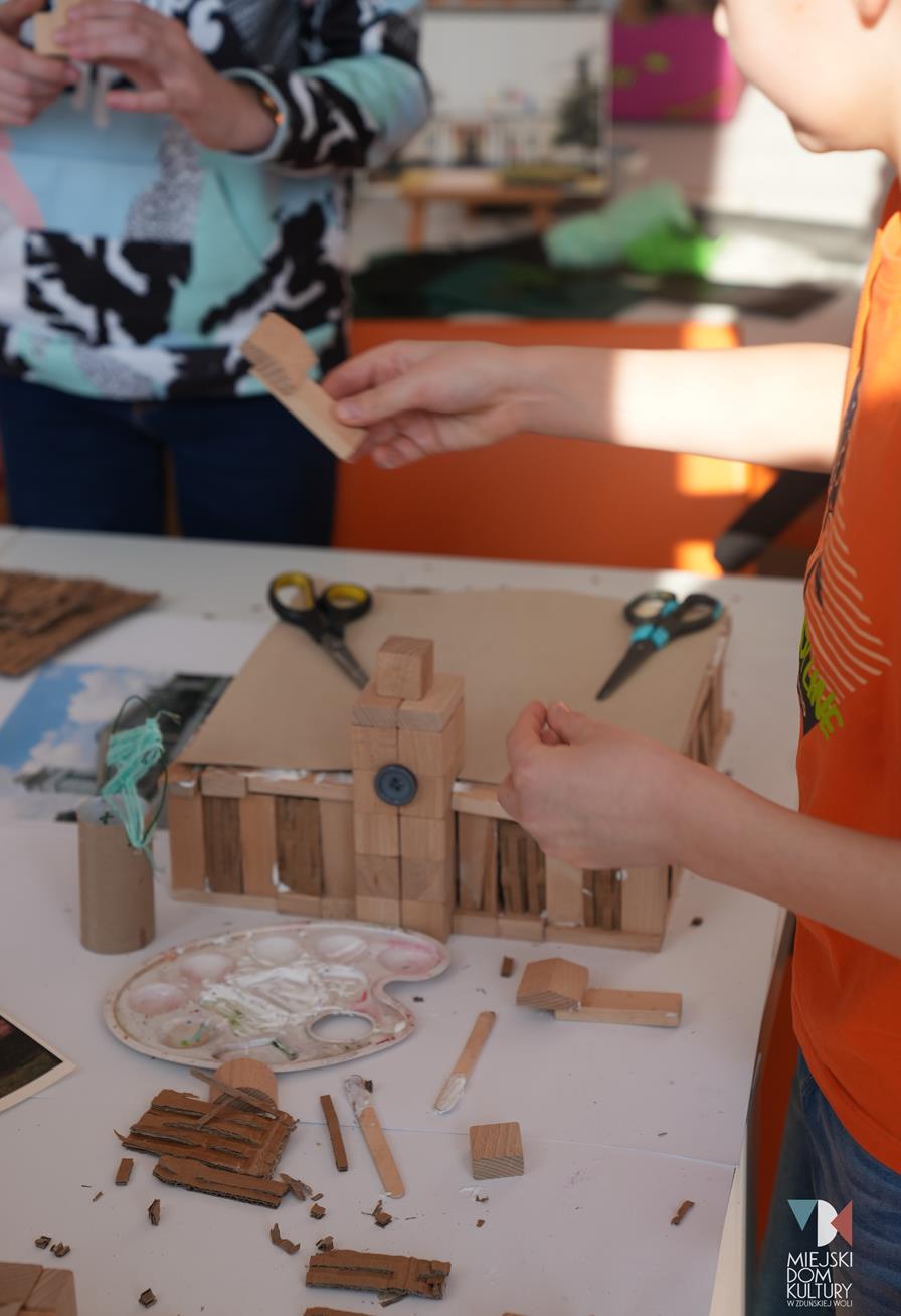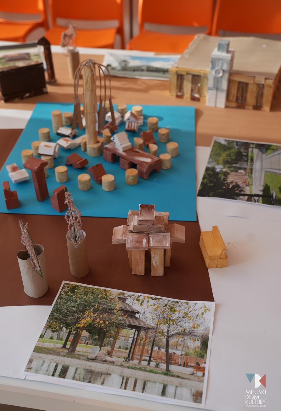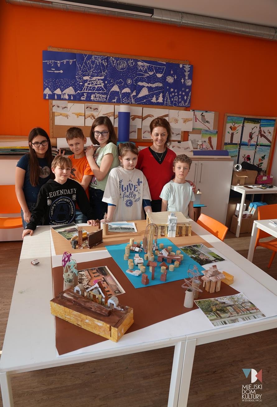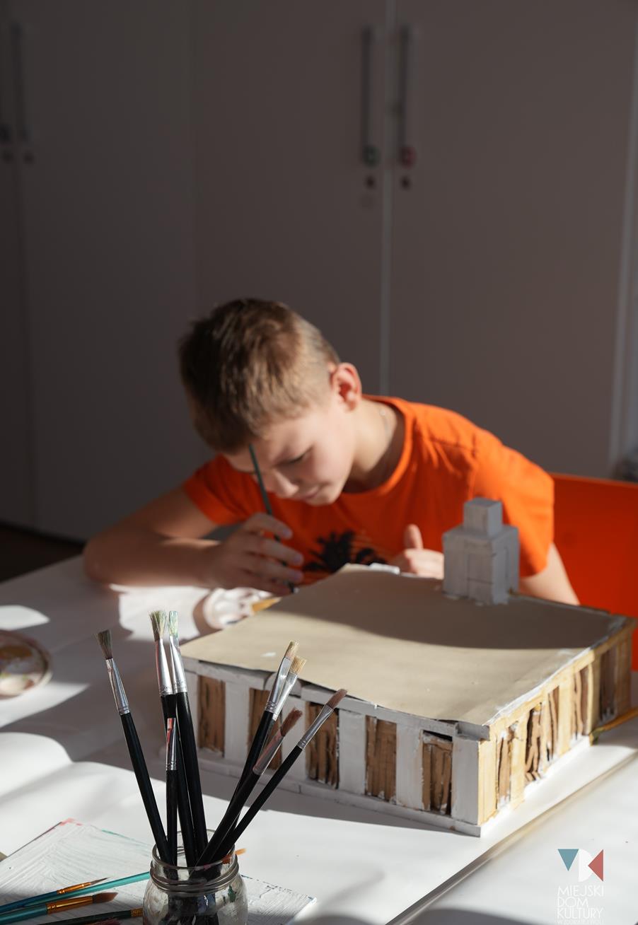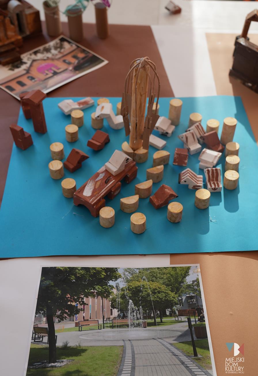 Przez dwa dni uczestnicy ferii pracowali również nad mentalną makietą miasta. Na warsztatach twórczych ,,Budujemy moje miasto” z drewna i papieru powstały projekty: Ratusza, dworca kolejowego, tężni w Parku Miejskim i Skweru im. Pawła Królikowskiego. Warsztaty bazowały na samodzielności, swobodzie twórczej i doświadczeniu sensorycznemu poprzez dotyk. Zajęcia przygotowała Arlena Przelazła-Matusiak, instruktor plastyki w MDK Ratusz.