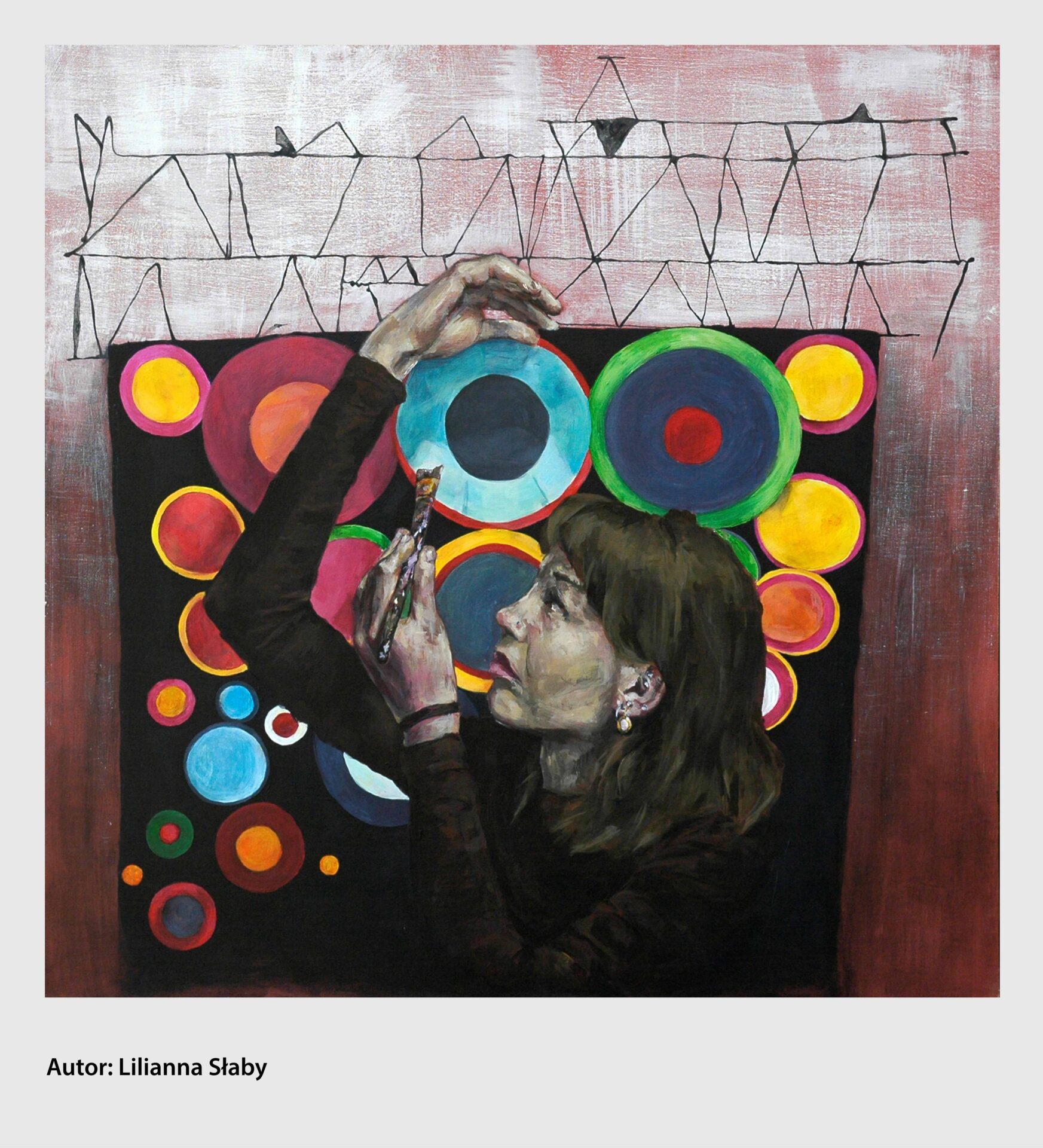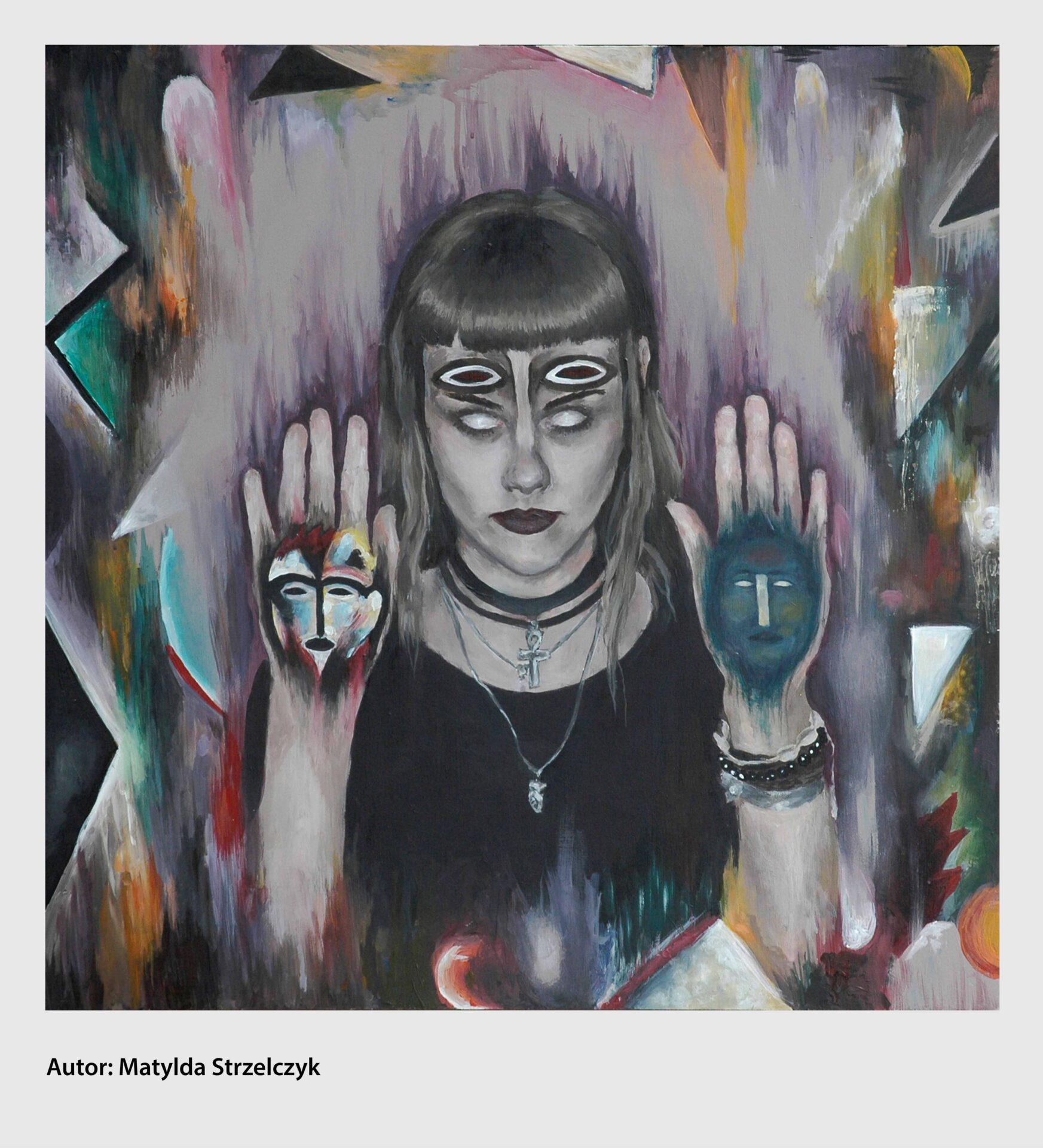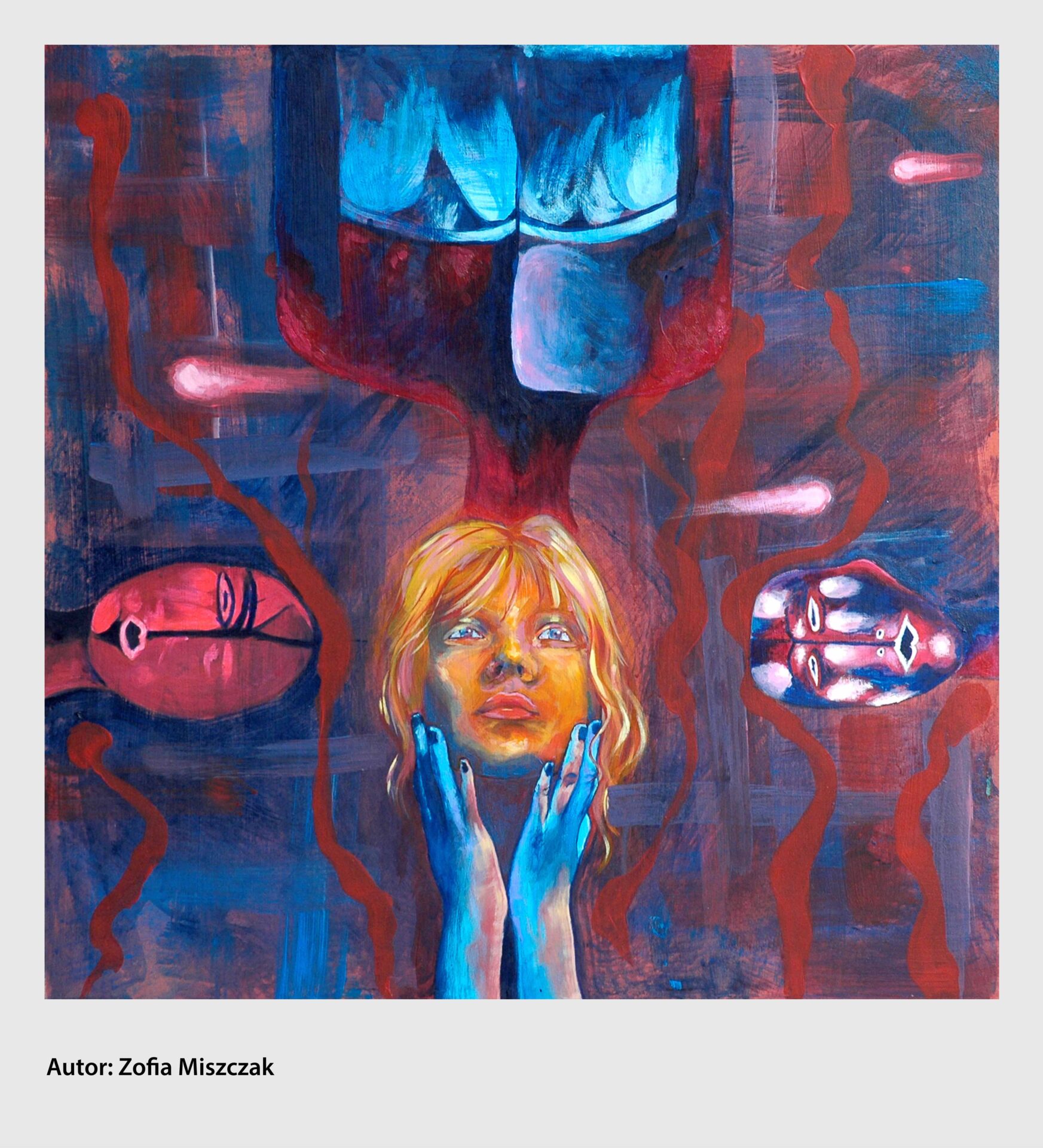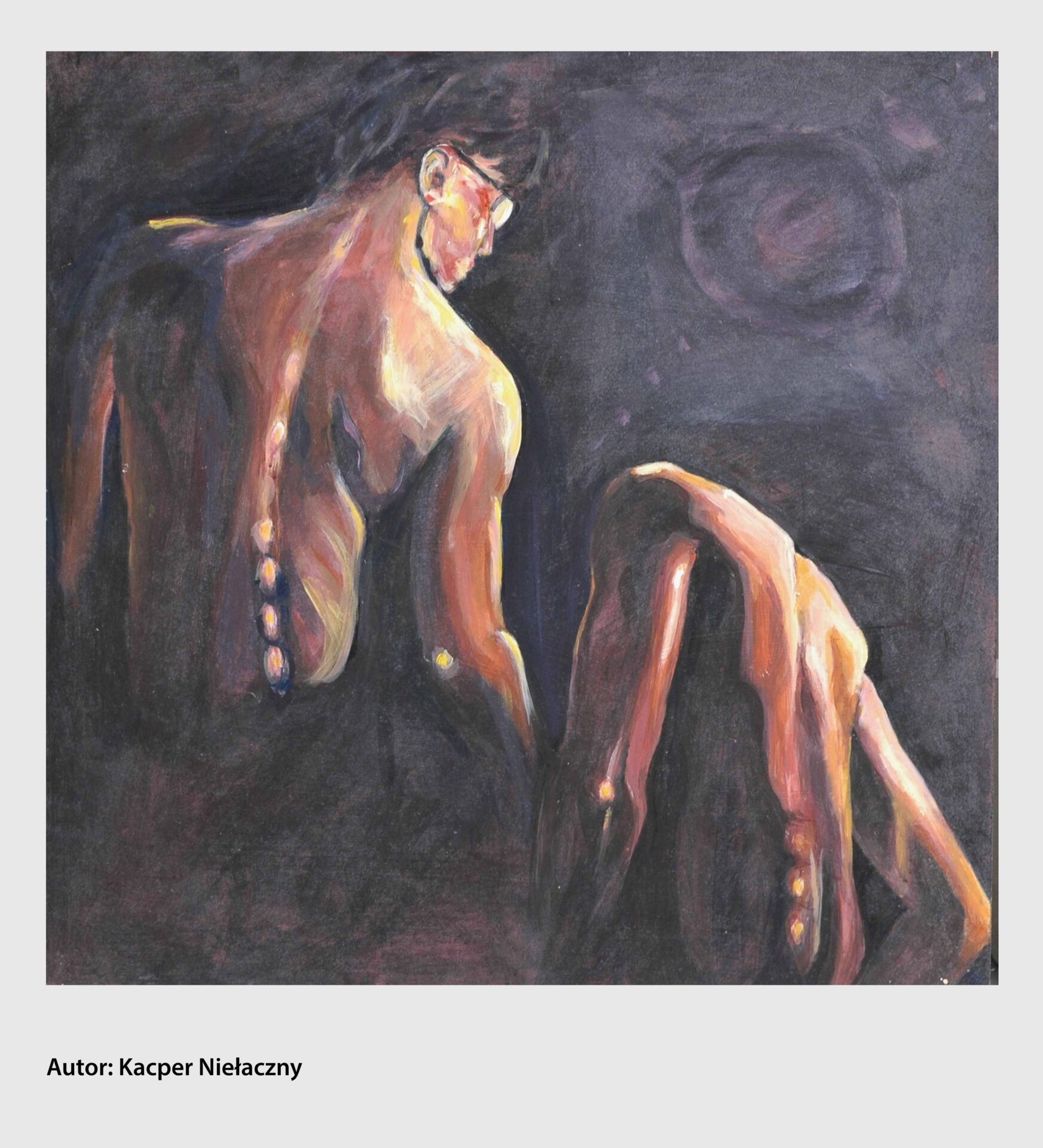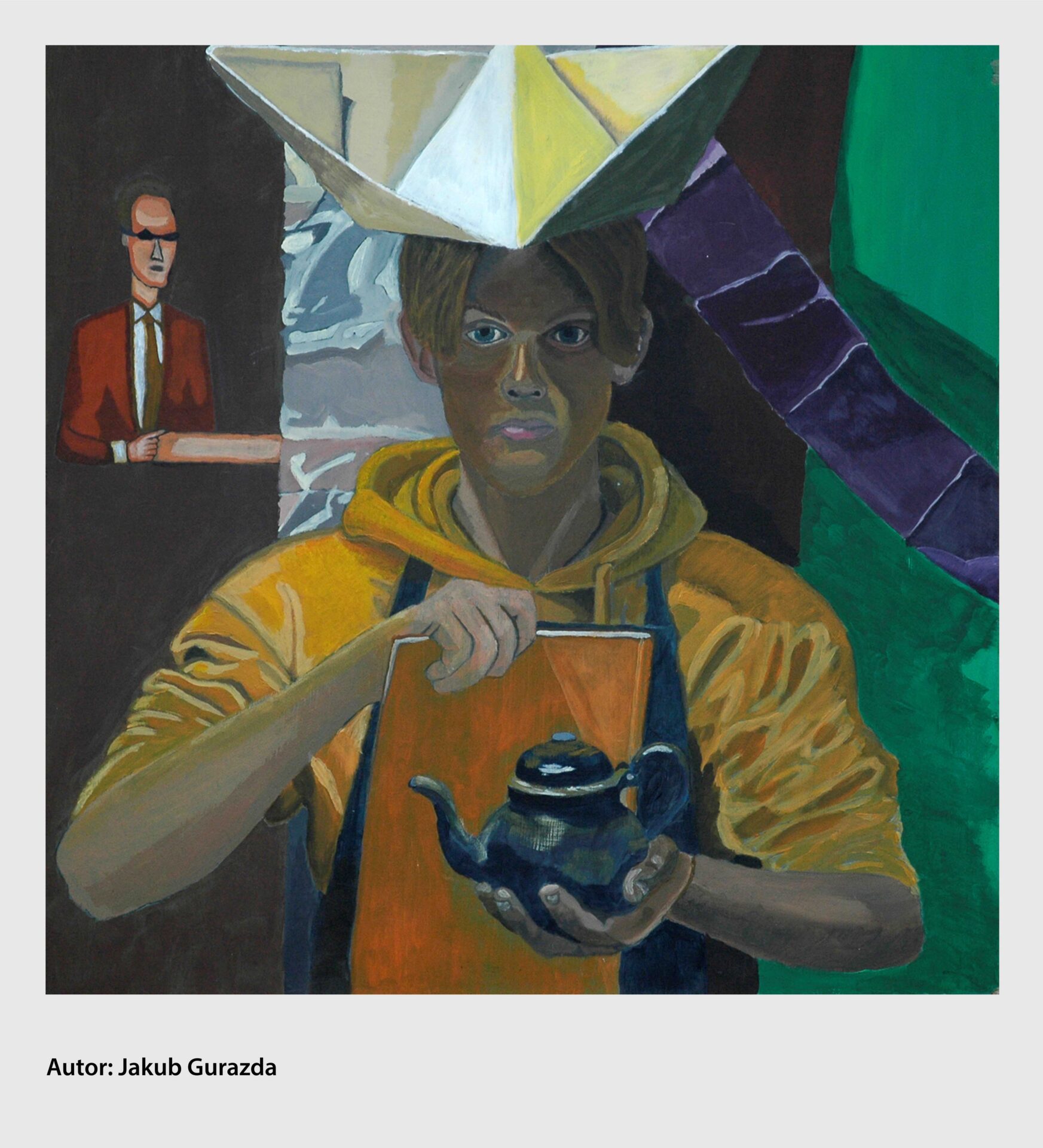 2. cykl „Kompozycje malarskie inspirowane twórczością Jerzego Nowosielskiego” autorstwa uczniów klasy IV. Prace pochodzą z roku szkolnego 2022/ 2023, powstały pod kierunkiem Angeliki Brzostowskiej – Pociechy, nauczycielki rysunku i malarstwa,