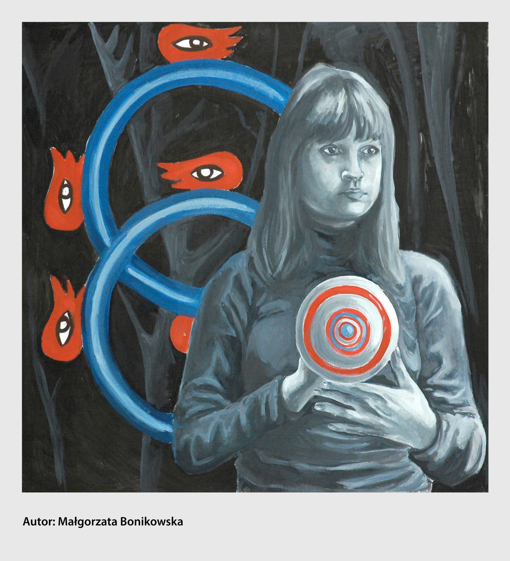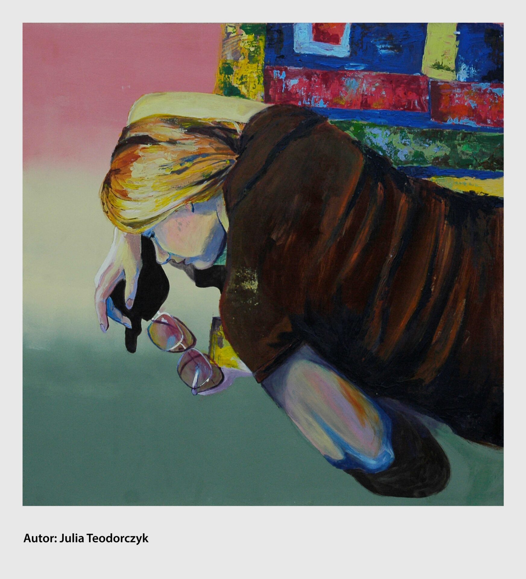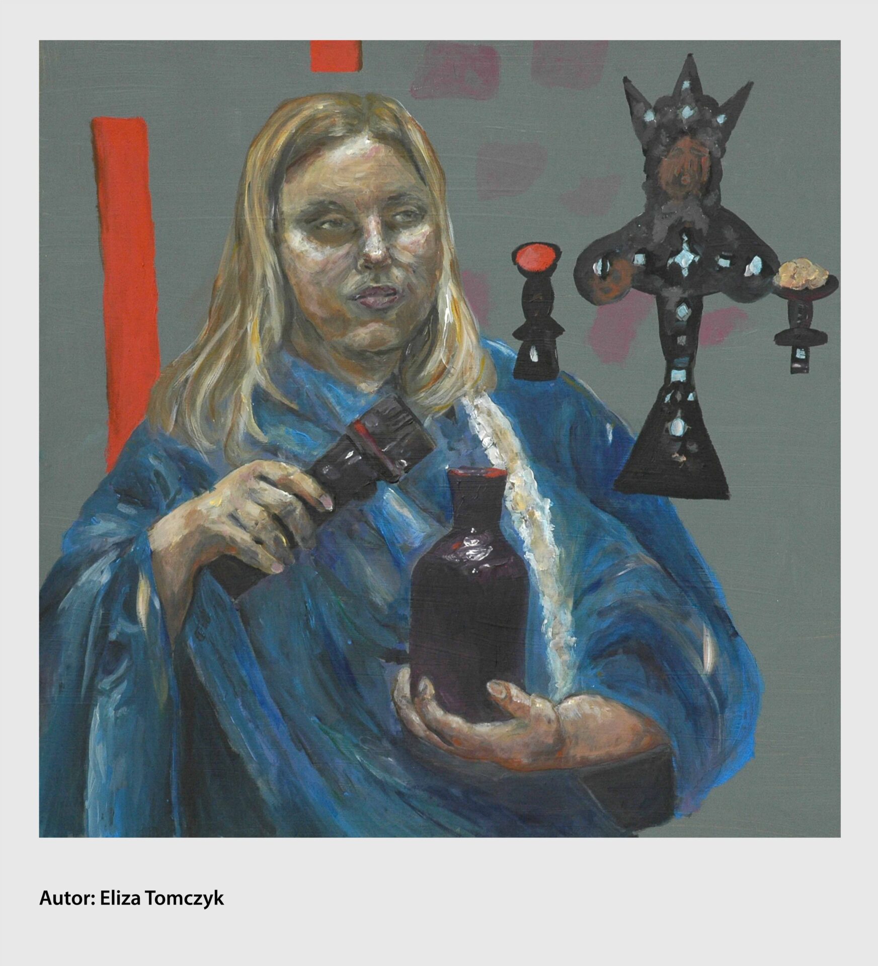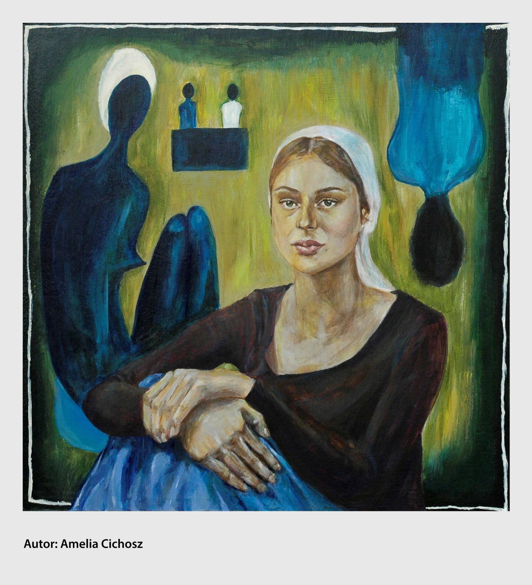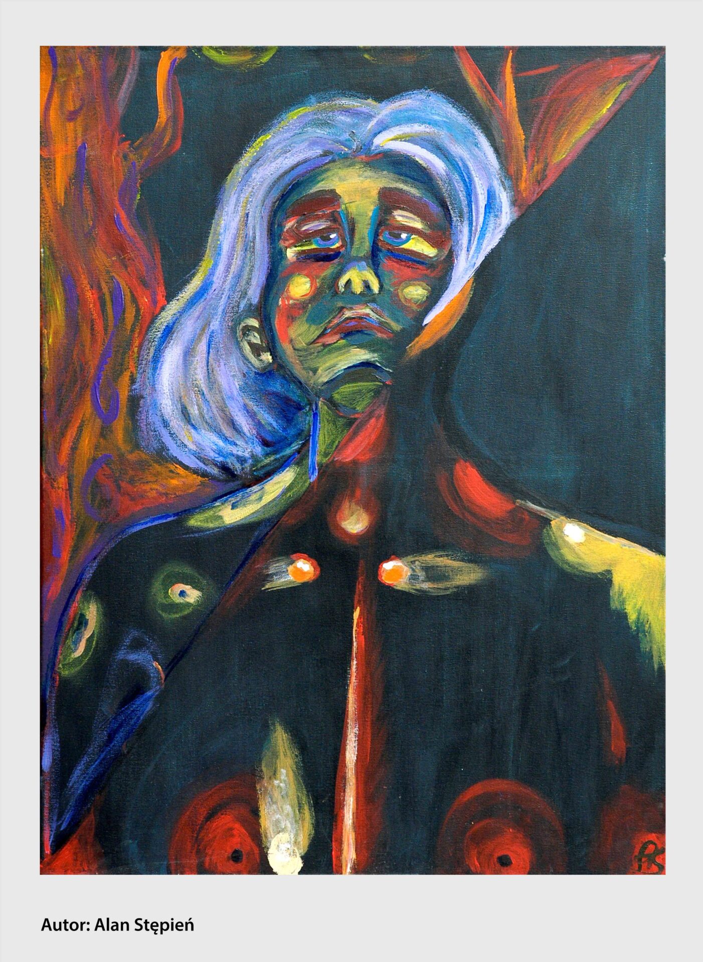 2. cykl „Kompozycje malarskie inspirowane twórczością Jerzego Nowosielskiego” autorstwa uczniów klasy IV. Prace pochodzą z roku szkolnego 2022/ 2023, powstały pod kierunkiem Angeliki Brzostowskiej – Pociechy, nauczycielki rysunku i malarstwa,