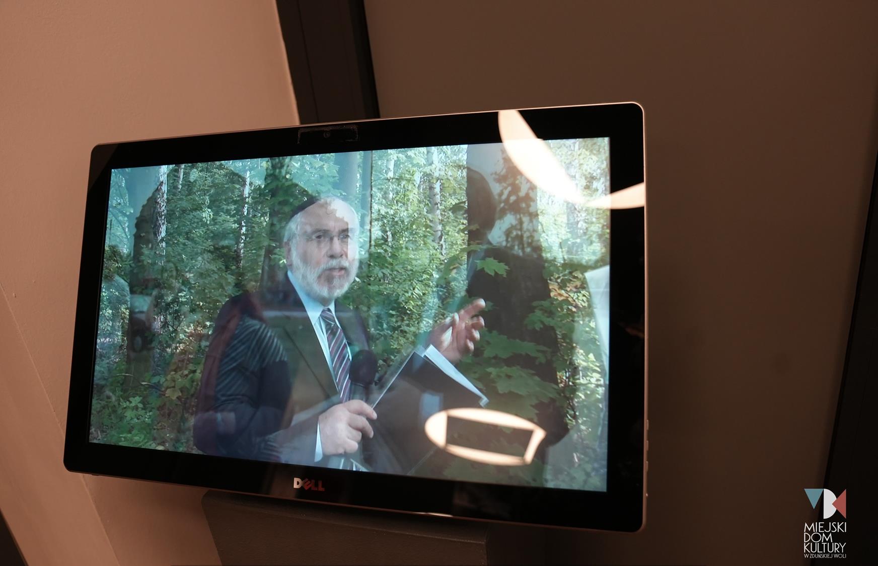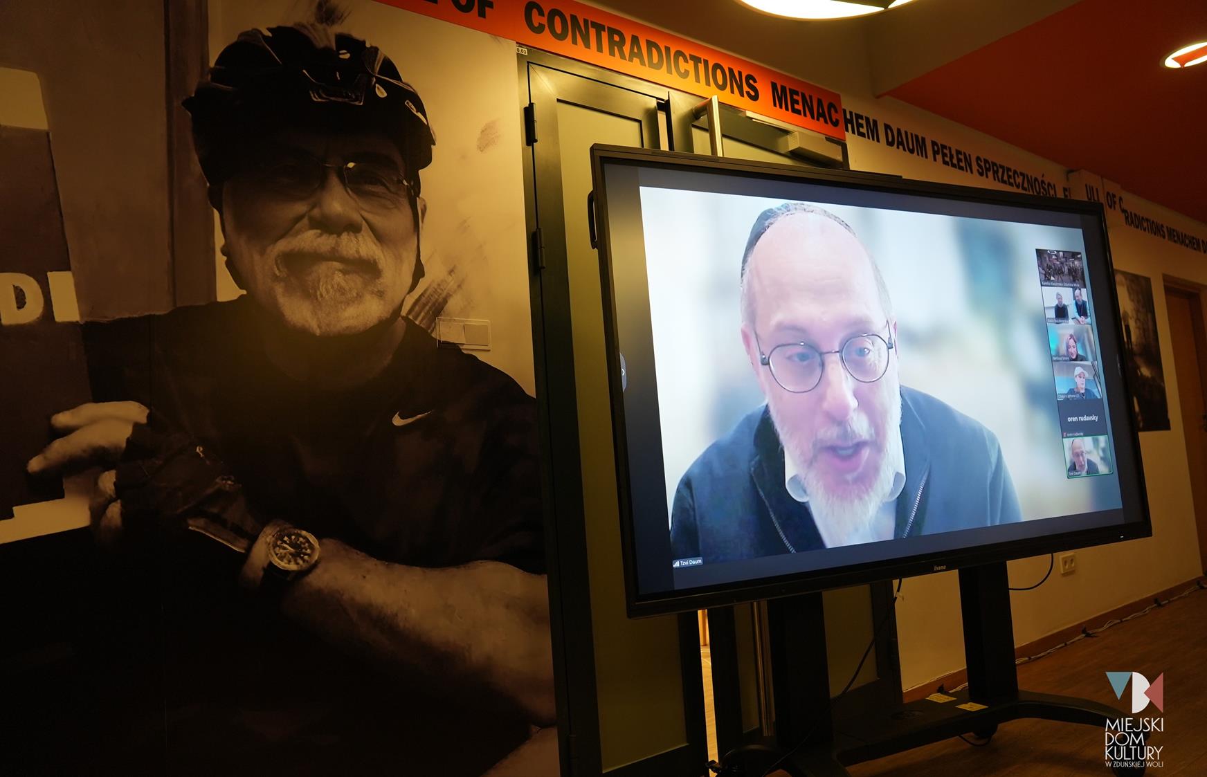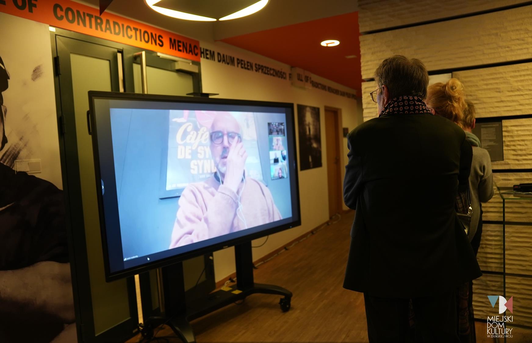 Transmisję z wernisażu obejrzeć można było na żywo na profilu Fb Cmentarza żydowskiego w Zduńskiej Woli / Jewish cemetery of Zdunska Wole. Za pomocą platformy Zoom połączyliśmy się z najbliższymi filmowca: żoną, synem i córką.