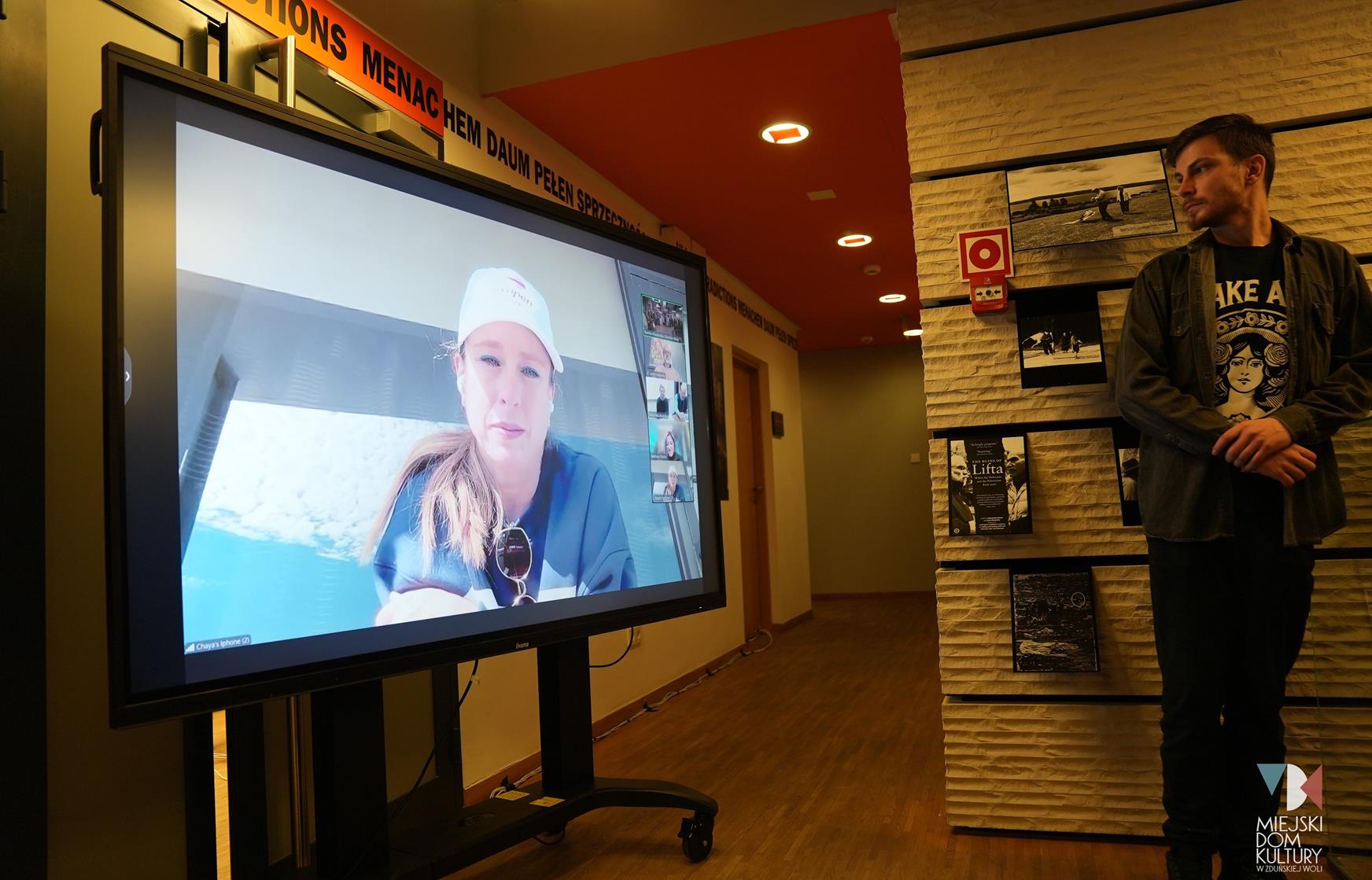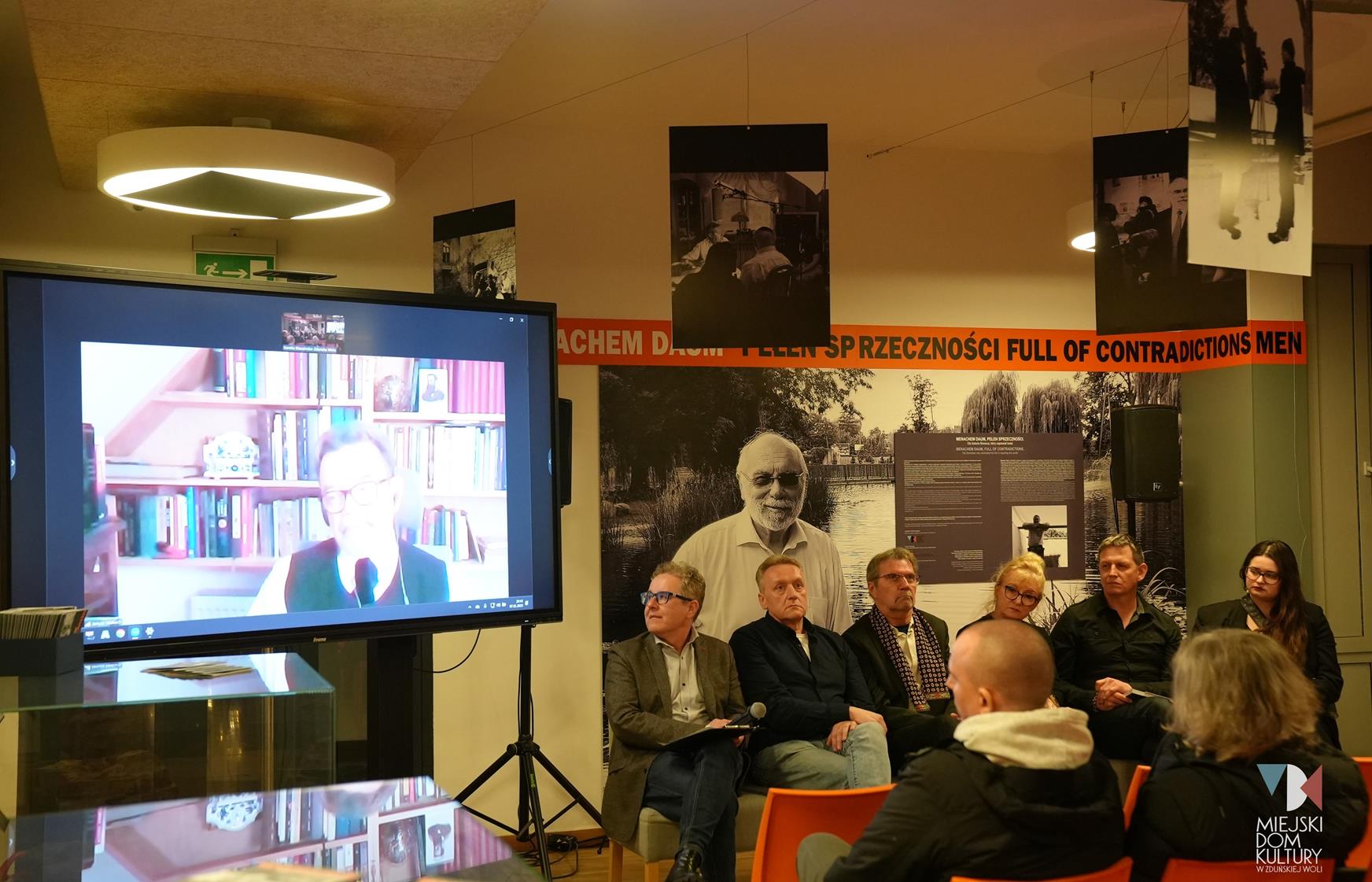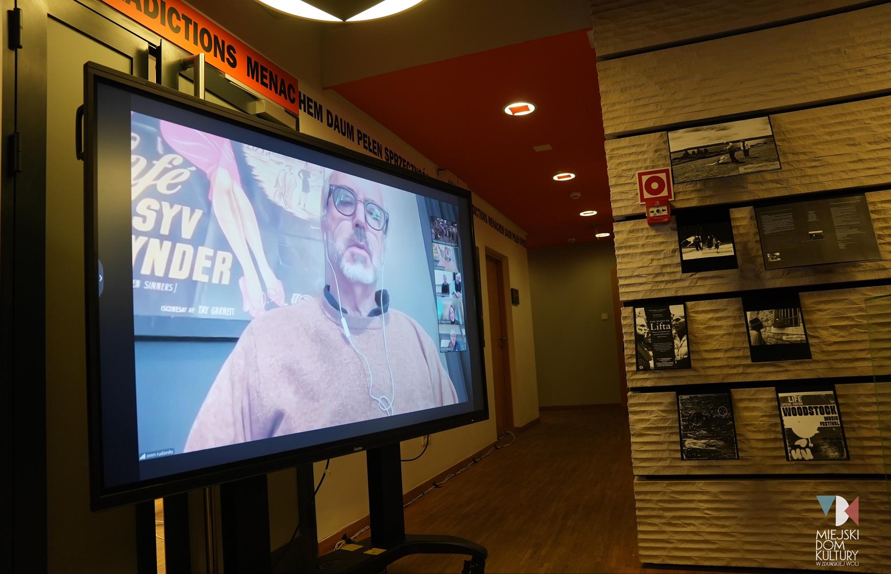 Transmisję z wernisażu obejrzeć można było na żywo na profilu Fb Cmentarza żydowskiego w Zduńskiej Woli / Jewish cemetery of Zdunska Wole. Za pomocą platformy Zoom połączyliśmy się z najbliższymi filmowca: żoną, synem i córką.