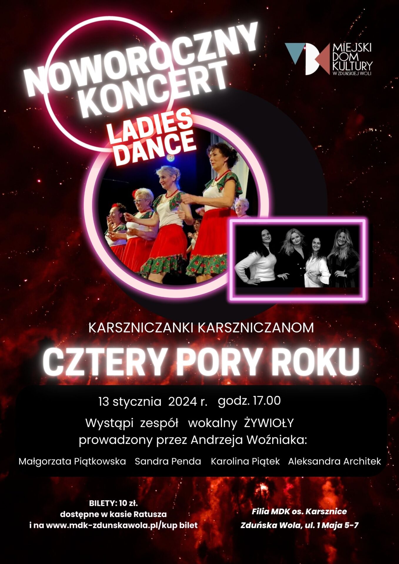 Zapraszamy na widowisko inspirowane czterema porami roku w wykonaniu zespołu ,,Ladies Dance”. Podczas Koncertu Noworocznego formacja zaprezentuje: taniec arabski, walc, salsę i polkę.