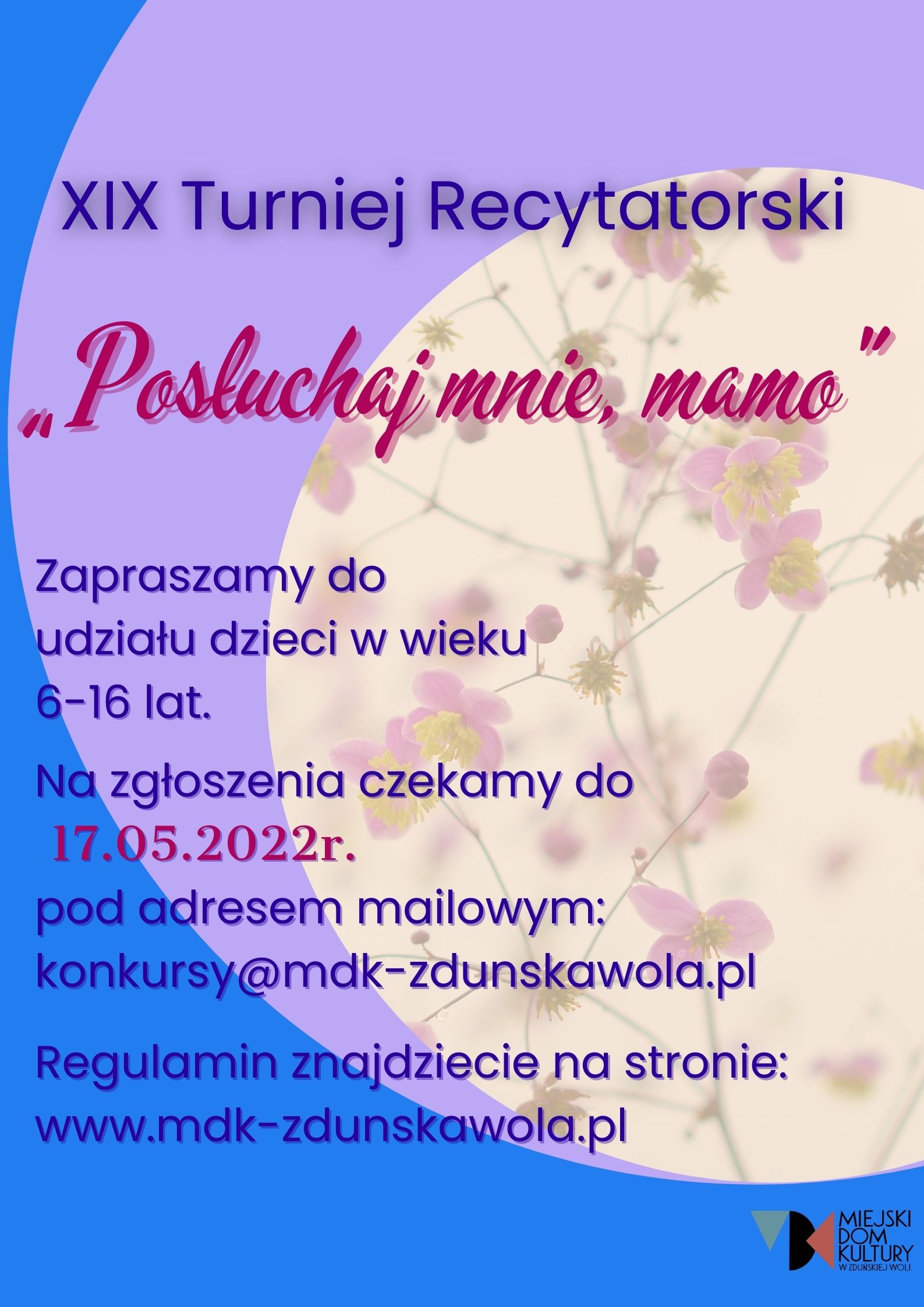 Jeśli chcecie wziąć udział w naszym konkursie, zapoznajcie się z regulaminem Regulamin, wypełnijcie kartę zgłoszenia Karta zgłoszenia do udziału XIX Turnieju Recytatorskim Posłuchaj mnie, mamo i prześlijcie do nas swoje zgłoszenie na adres: konkursy@mdk-zdunskawola.pl do 17 maja.