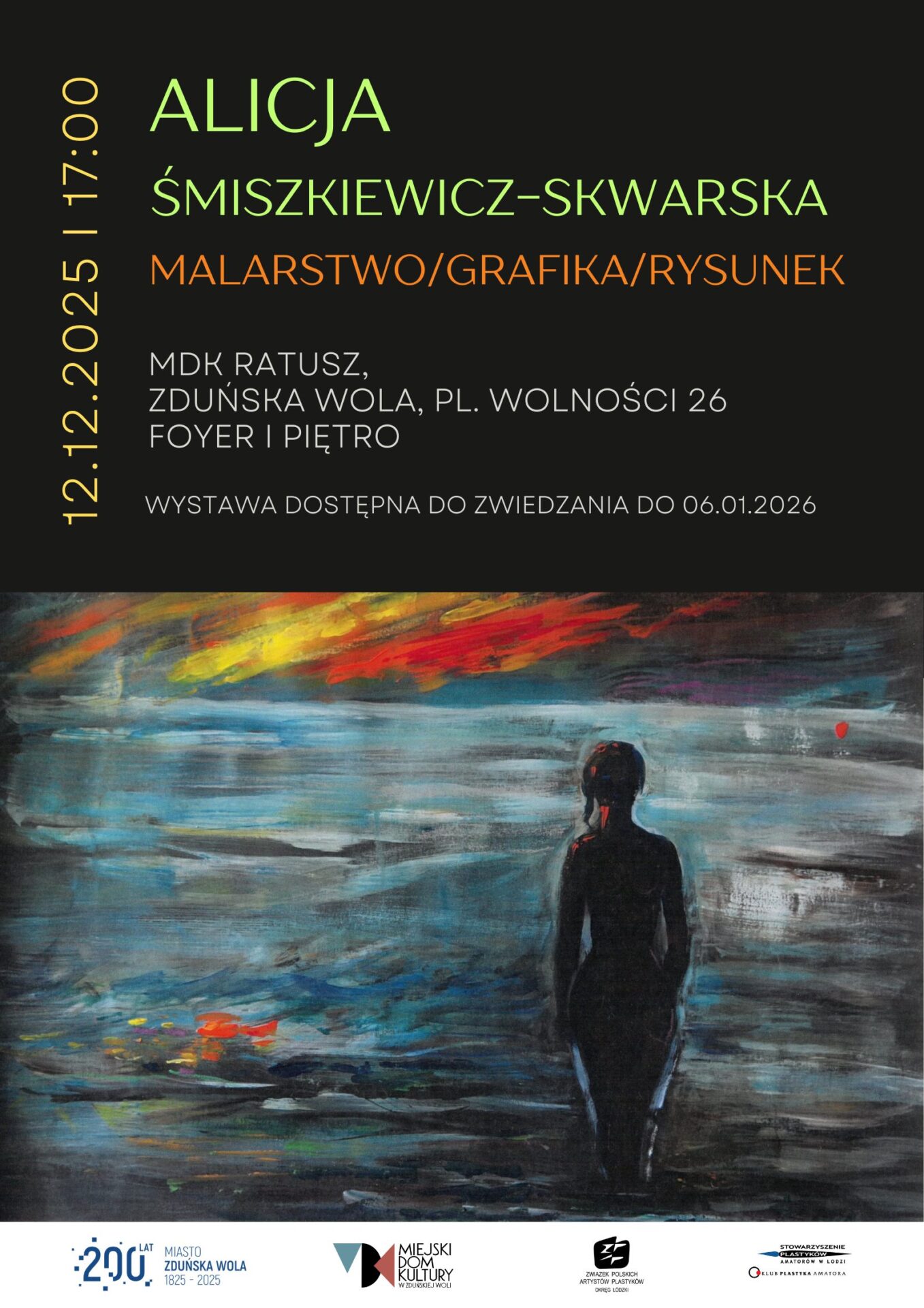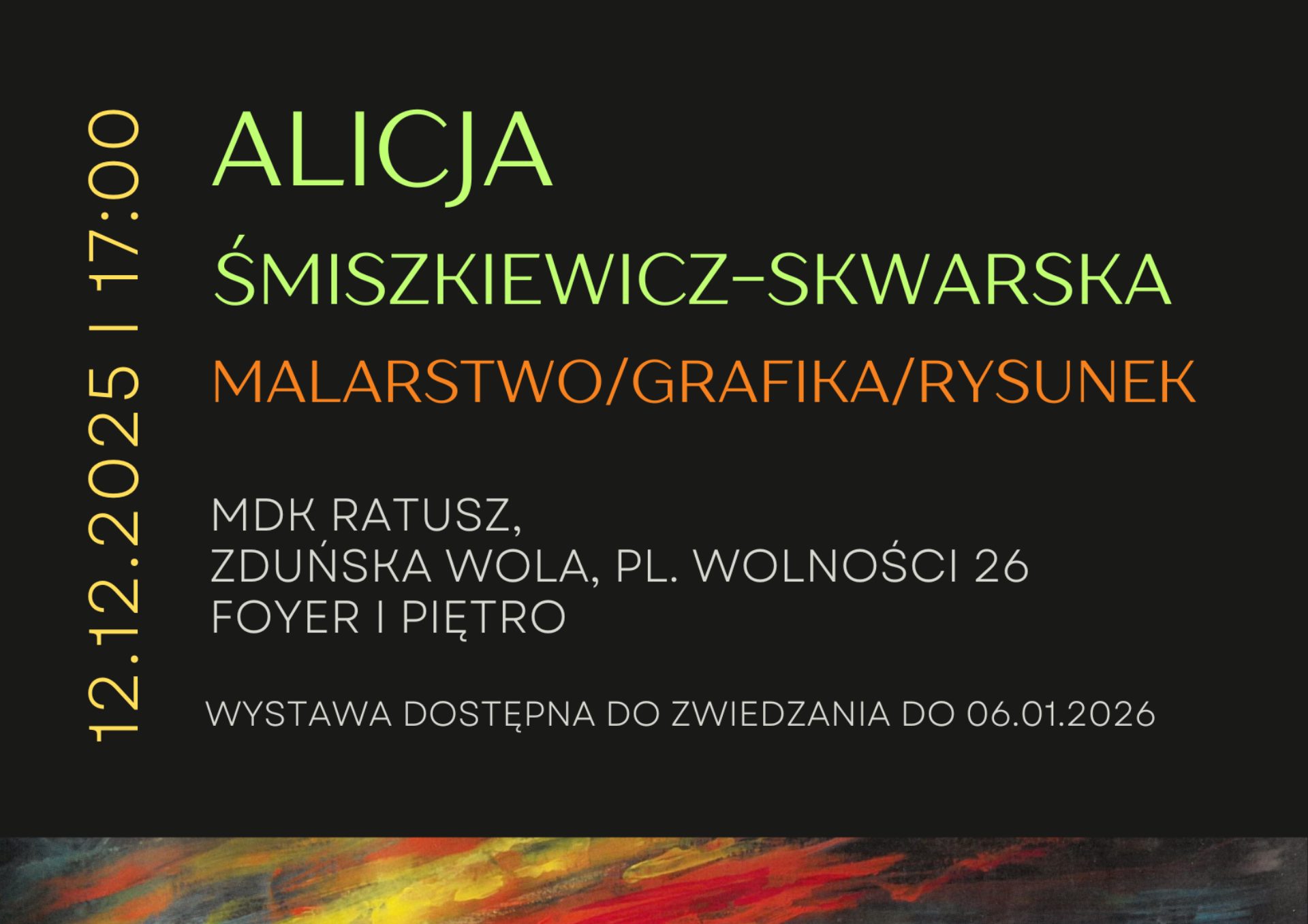 Na wernisaż wystawy prac Alicji Śmiszkiewicz – Skwarskiej zapraszamy 12 grudnia 2025 roku, godz. 17.00, foyer Miejskiego Domu Kultury.