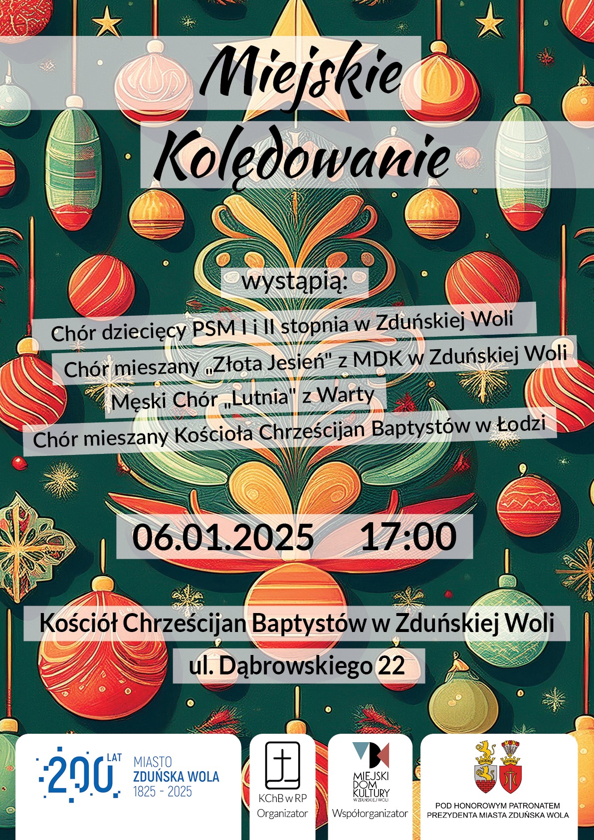 Już 6 stycznia, w święto Trzech Króli, w Kościele Chrześcijan Baptystów w Zduńskiej Woli odbędzie się pierwszy z serii koncertów chóralnych pod nazwą ,,Miejskie Kolędowanie”, organizowany w ramach obchodów 200-lecia miasta Zduńska Wola.
