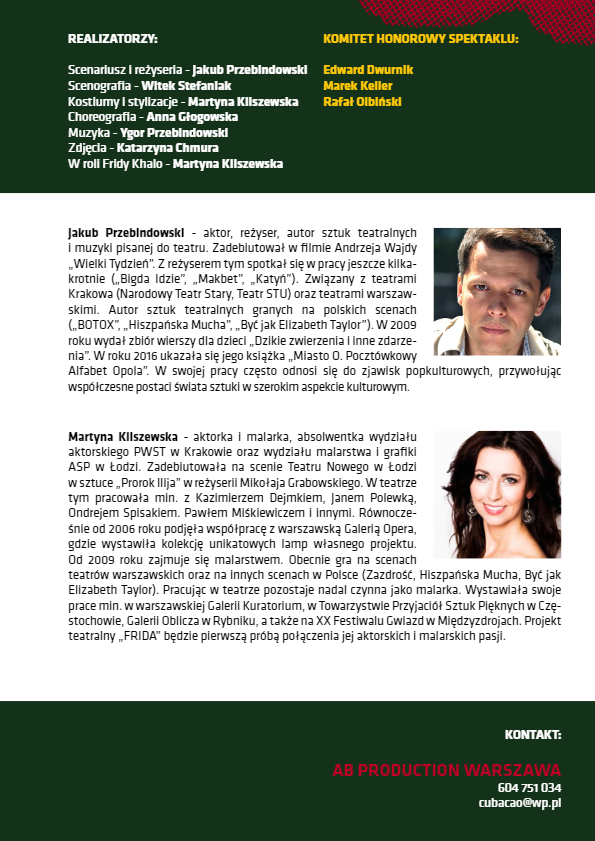 Spektakl jest autorskim zapisem dramaturgicznym Jakuba Przebindowskiego. Jest zderzeniem teatru, video art, performance, video teatru, opowiadającym o złożonym i wyjątkowym życiu malarki. W roli Fridy Khalo wystąpi aktorka i malarka Martyna Kliszewska.