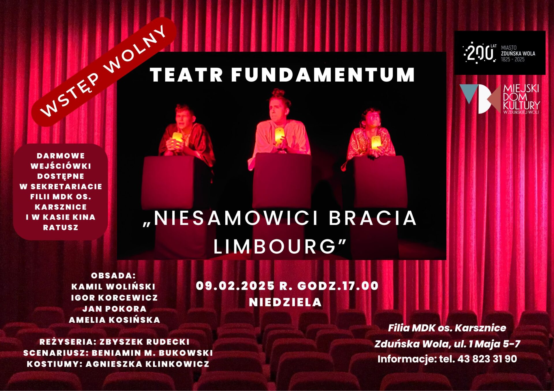 Darmowe wejściówki dostępne w sekretariacie Filii MDK os. Karsznice oraz w kasie MDK Ratusz, pl. Wolności 26.