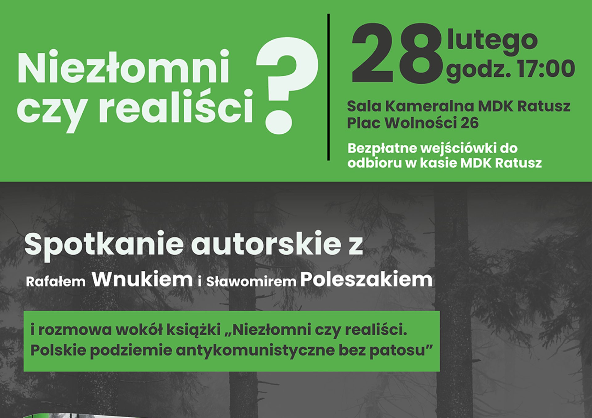 Miejski Dom Kultury Ratusz i Muzeum Historii Miasta Zduńska Wola zapraszają na spotkanie poświęcone książce Rafała Wnuka i Sławomira Poleszaka „Niezłomni czy realiści. Polskie podziemie antykomunistyczne bez patosu”. Rozmowę z autorami poprowadzą Paweł Perdek i Tomasz Polkowski.