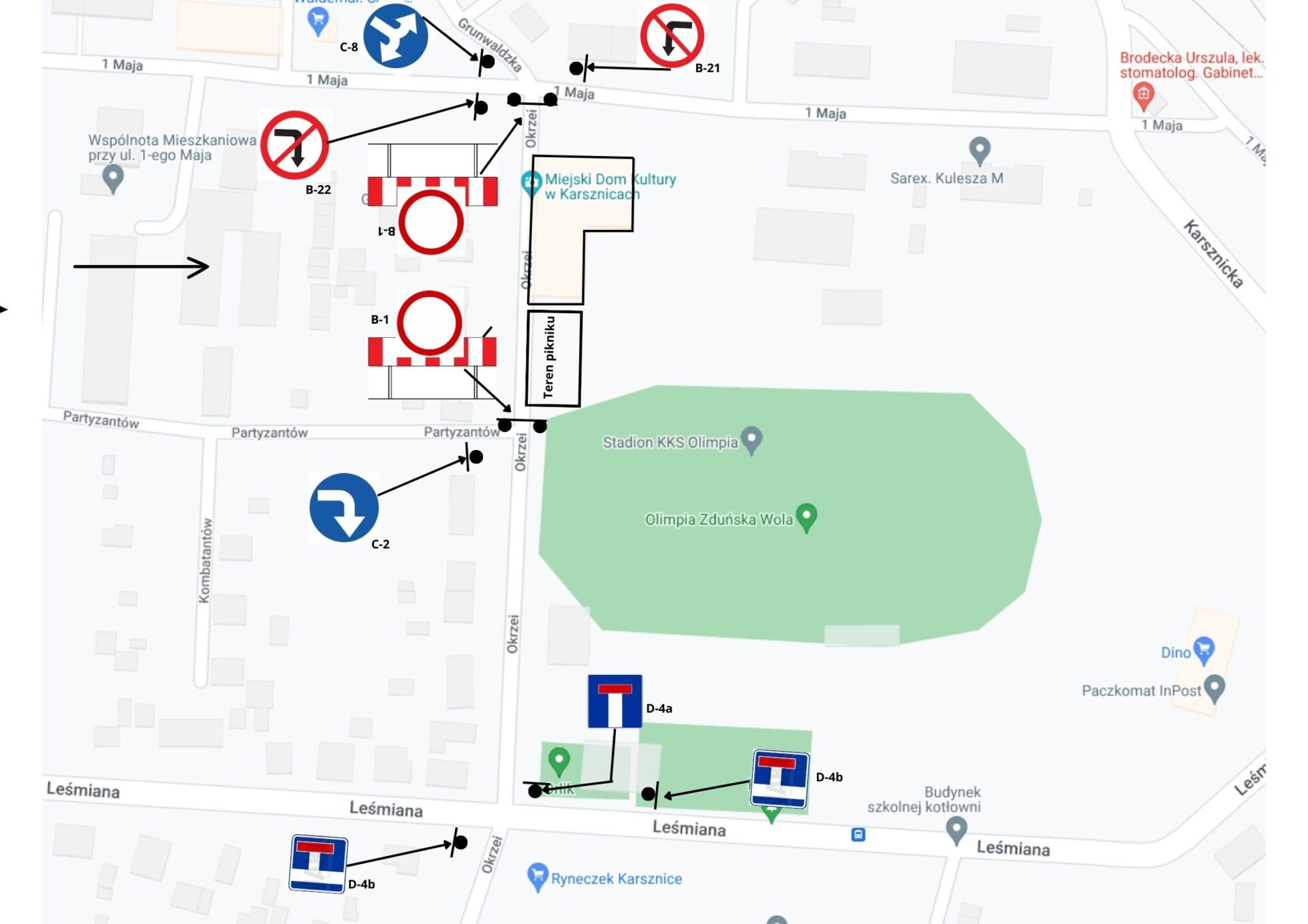 W związku z organizacją imprezy „Piknik rodzinny – Karsznice 2024″, która będzie mieściła się na parkingu przy budynku filii MDK i w obrębie Stadionu Miejskiego przy ul Okrzei nastąpi zmiana w organizacji ruchu drogowego na osiedlu Karsznice.