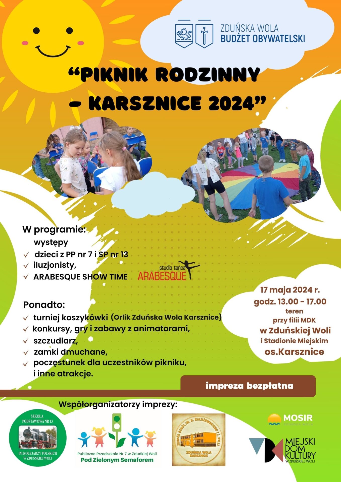 Filia MDK os. Karsznice zaprasza na „Piknik rodzinny – Karsznice 2024”. Wydarzenie organizowane jest w ramach Budżetu Obywatelskiego Miasta Zduńska Wola na 2024 rok. Współorganizatorami pikniku są: Publiczne Przedszkole „Pod Zielonym Semaforem” w Zduńskiej Woli, Szkoła Podstawowa nr 13 im. Kolejarzy Polskich w Zduńskiej Woli oraz Zespół Szkół im. Kazimierza Kałużewskiego i Juliusza Sylli w Zduńskiej Woli.