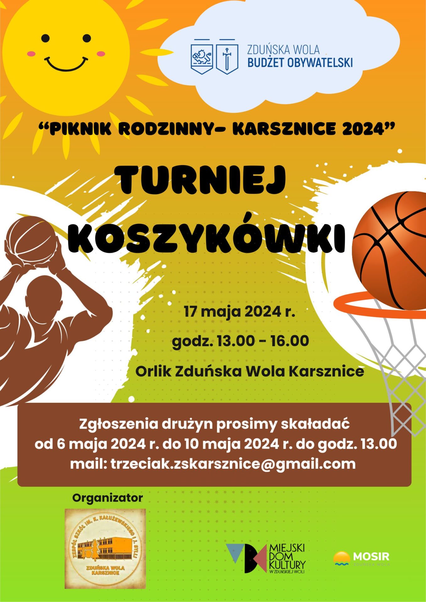 Tego dnia od godziny 13.00 do 16.00 na boisku Orlik Zduńska Wola Karsznice zaplanowany jest również Turniej Koszykówki 3×3 (regulamin turnieju do pobrania tutaj: Regulamin Turnieju Koszykówki zgłoszenia od 6 do 10 maja do godziny 13.00 pod adresem: trzeciak.zskarsznice@gmail.com).