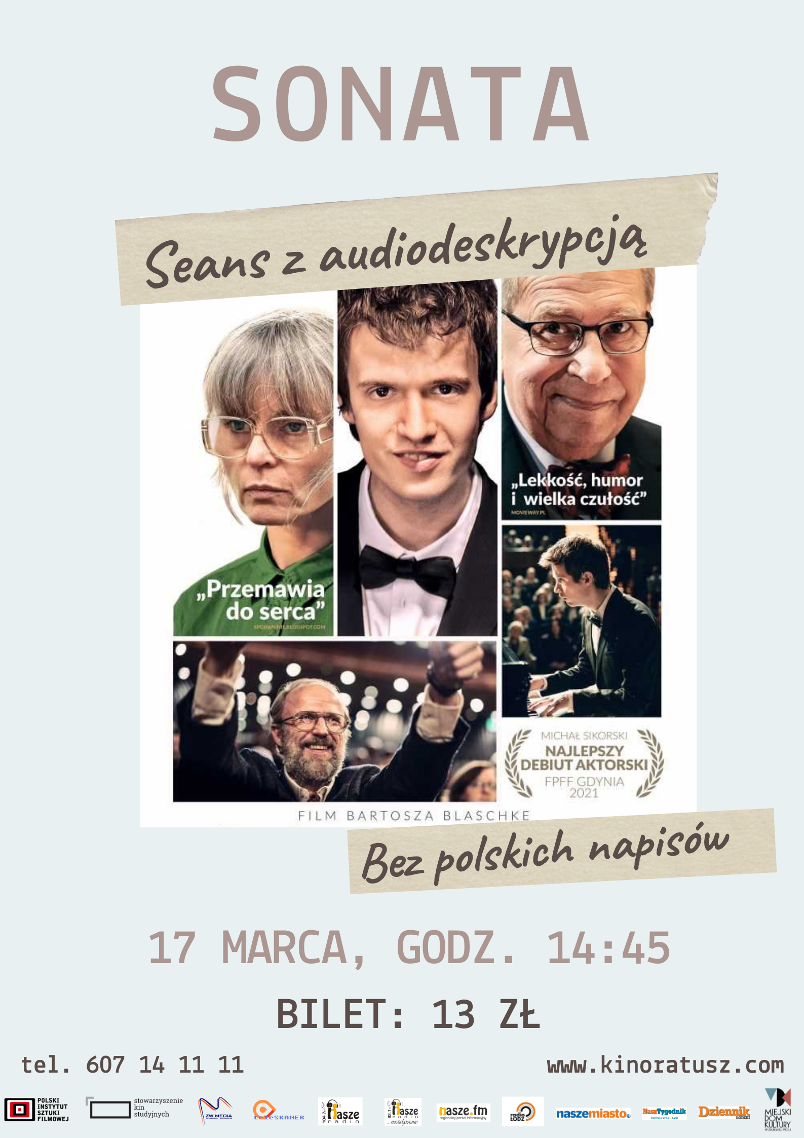 Seans odbędzie się 17 marca o godzinie 14.45. Cena biletu: 13 zł. Bilety do nabycia w kasie MDK Ratusz i na http://www.kinoratusz.com