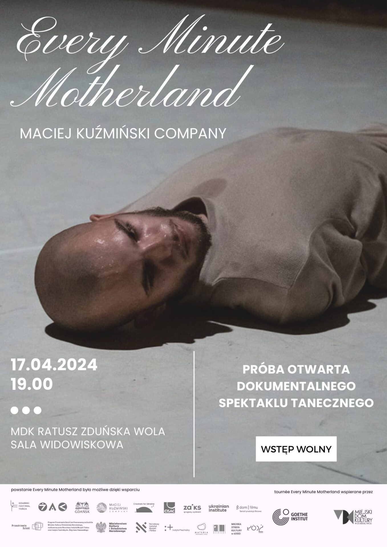 Choreograf Maciej Kuźmiński uważa wojnę za potężną siłę, która raz za razem wprowadza świat w fizyczny i egzystencjalny ruch, kwestionując nasze wartości, tożsamość i idee bezpieczeństwa i domu. W Every Minute Motherland przeżycie wyryte w ciałach tancerzy zostanie uwolnione na scenie w emocjonalnej, a zarazem filozoficznej opowieści o podróży ludzkiego ciała i ducha w czasie i przestrzeni.