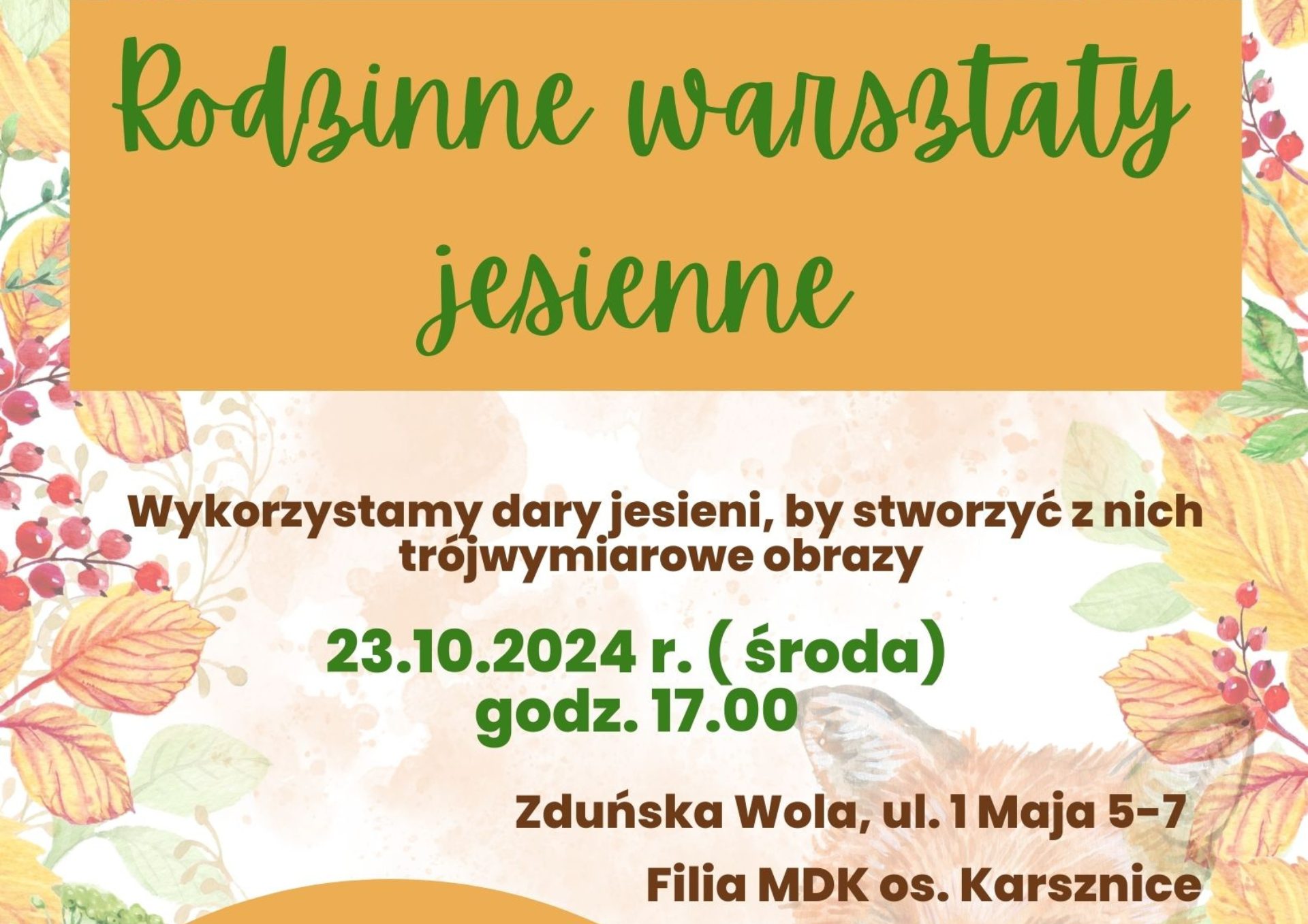 Warsztaty odbędą się 23.10.2024 r. o godzinie 17:00 w filii Miejskiego Domu Kultury os. Karsznice.