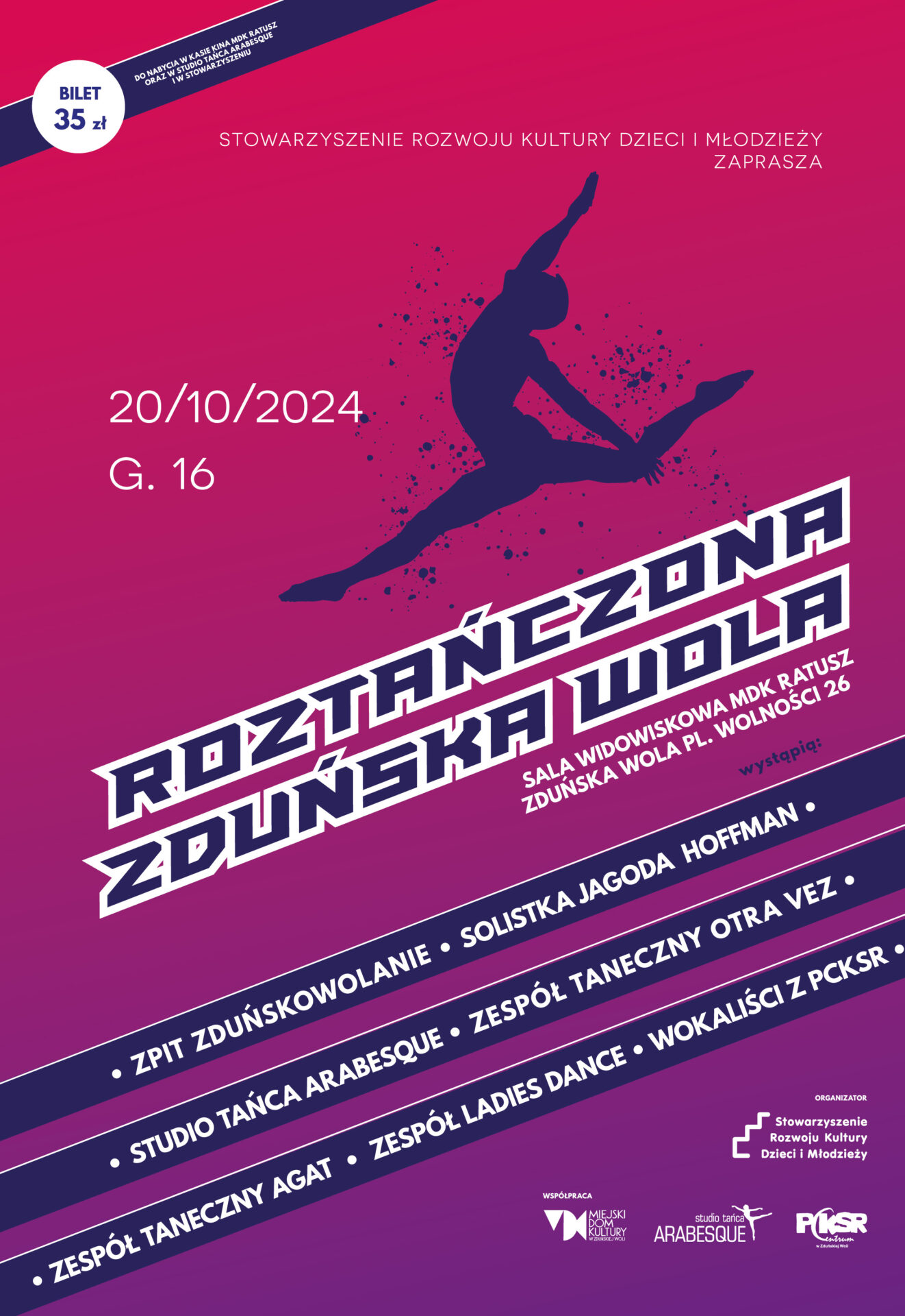 Bilety: 35 zł dostępne w kasie MDK Ratusz, online: https://tiny.pl/nb2w_w6x oraz w Studiu Tańca ,,Arabesque” i w Stowarzyszeniu Rozwoju Kultury Dzieci i Młodzieży.