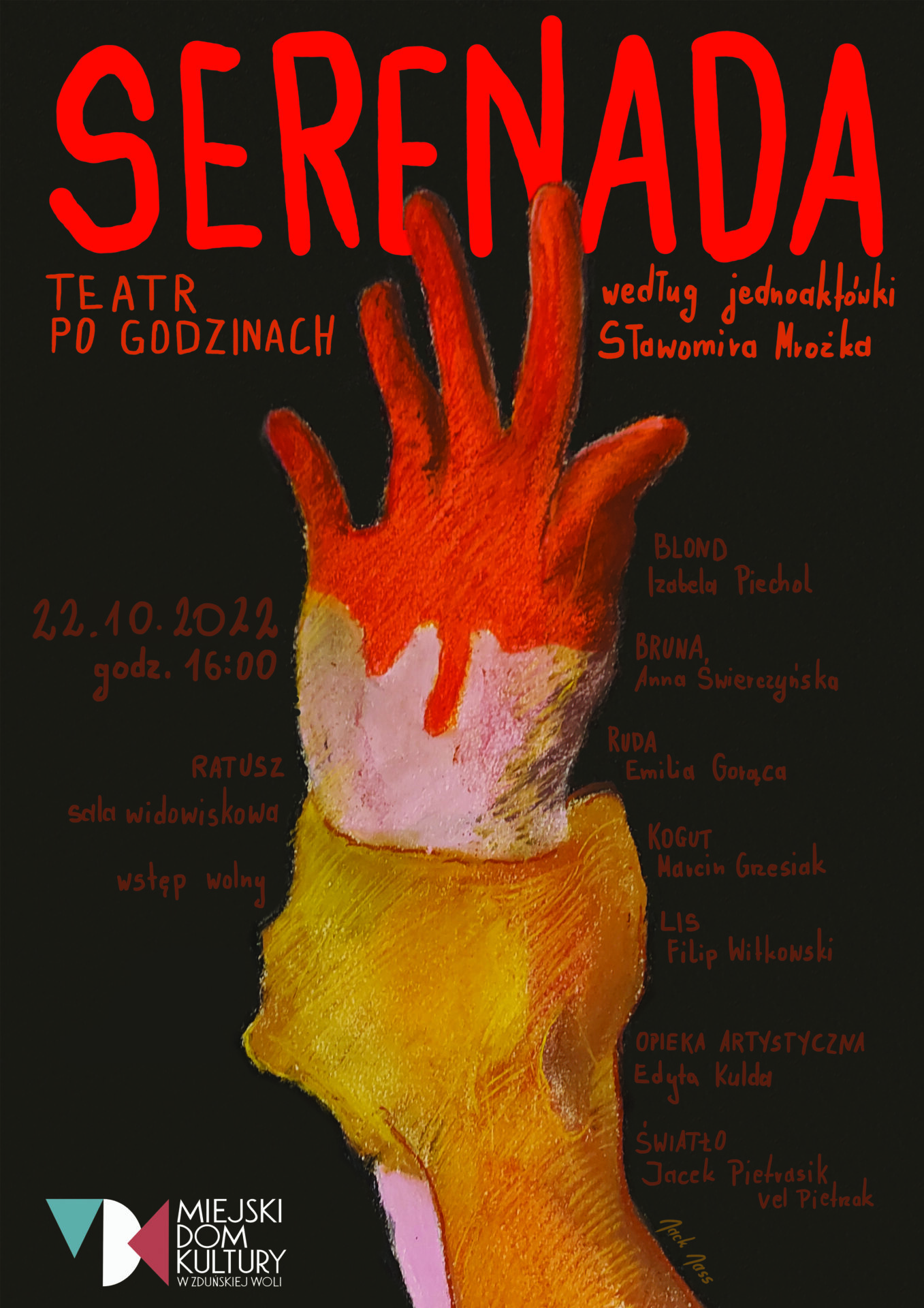 – Pomysłów na realizację spektaklu mieliśmy wiele. W trakcie teatralnych poszukiwań z otchłani pamięci wykopaliśmy tekst Sławomira Mrożka, mistrza absurdu, jednoaktówkę „Serenada”. Zwierzęce postaci: Kogut, Kury i Lis tworzą prostą i zabawną historyjkę z nutką kryminalnego dreszczyku w tle. Relacje pomiędzy nimi są tylko metaforą, która powinna zwrócić naszą uwagę na to, kim tak naprawdę jest człowiek w otaczającym nas, współczesnym świecie – mówiła jeszcze przed premierą Edyta Kulda, reżyser, opiekun artystyczny ,,Teatru po Godzinach”.