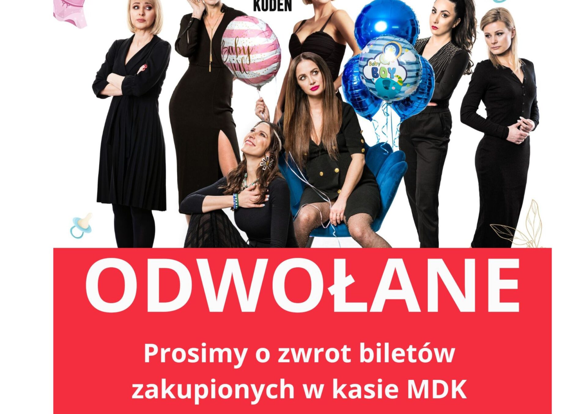 ,,Z przyczyn niezależnych od nas ( zalanie sprzętu oraz scenografii podczas podtopienia magazynu) zmuszeni jesteśmy odwołać spektakl BABY SHOWER, który zaplanowany był na 22 września o godzinie 17.00 w MDK Ratusz w Zduńskiej Woli”.