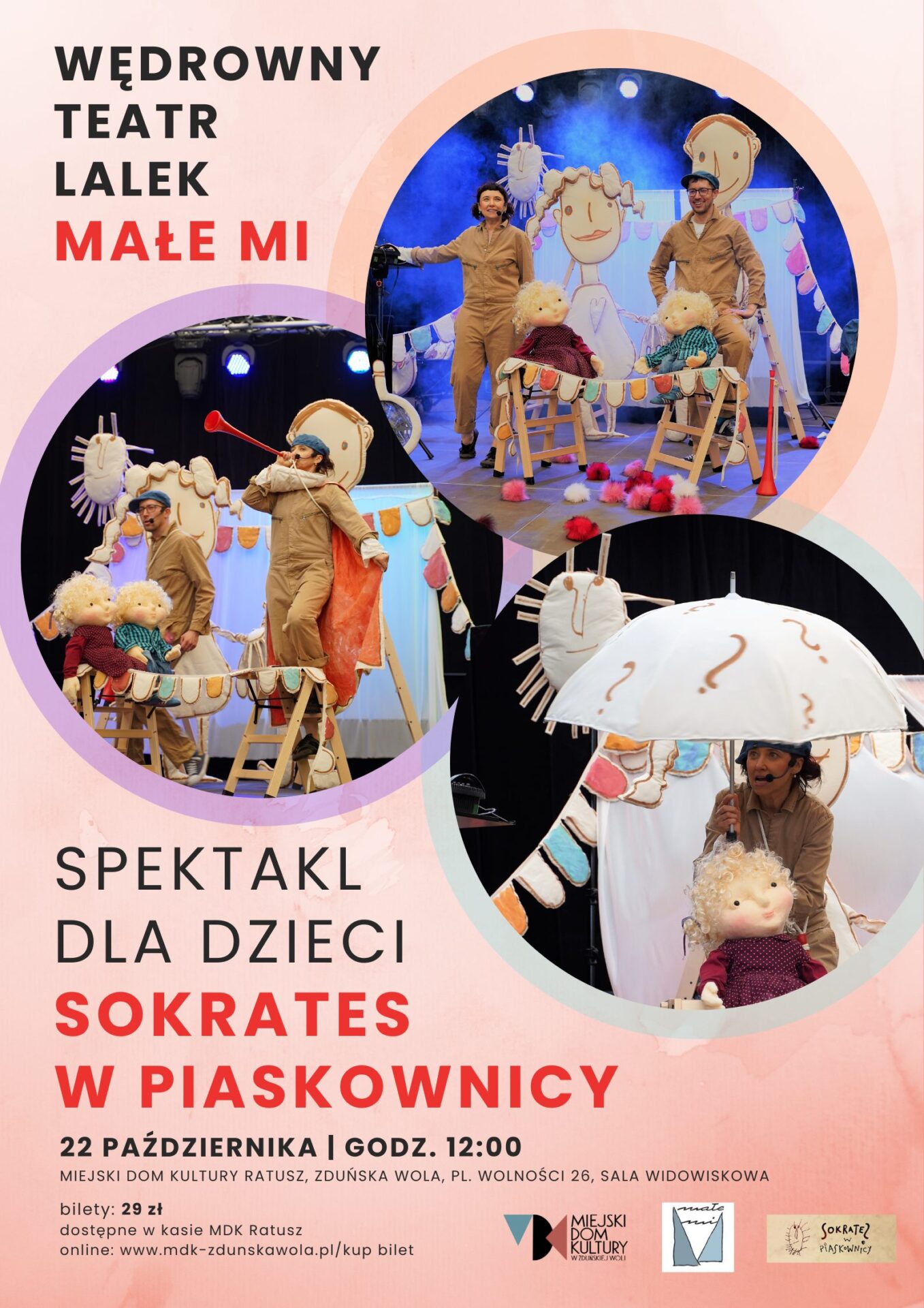,,Sokrates w piaskownicy” w wykonaniu Wędrownego Teatru Lalek ,,Małe Mi”, to przedstawienie lalkowe. Spektakl składa się z sześciu etiud. Każda z nich jest odrębną, misternie opracowaną formą teatralną z profesjonalnie przygotowaną scenografią, muzyką, piosenkami.