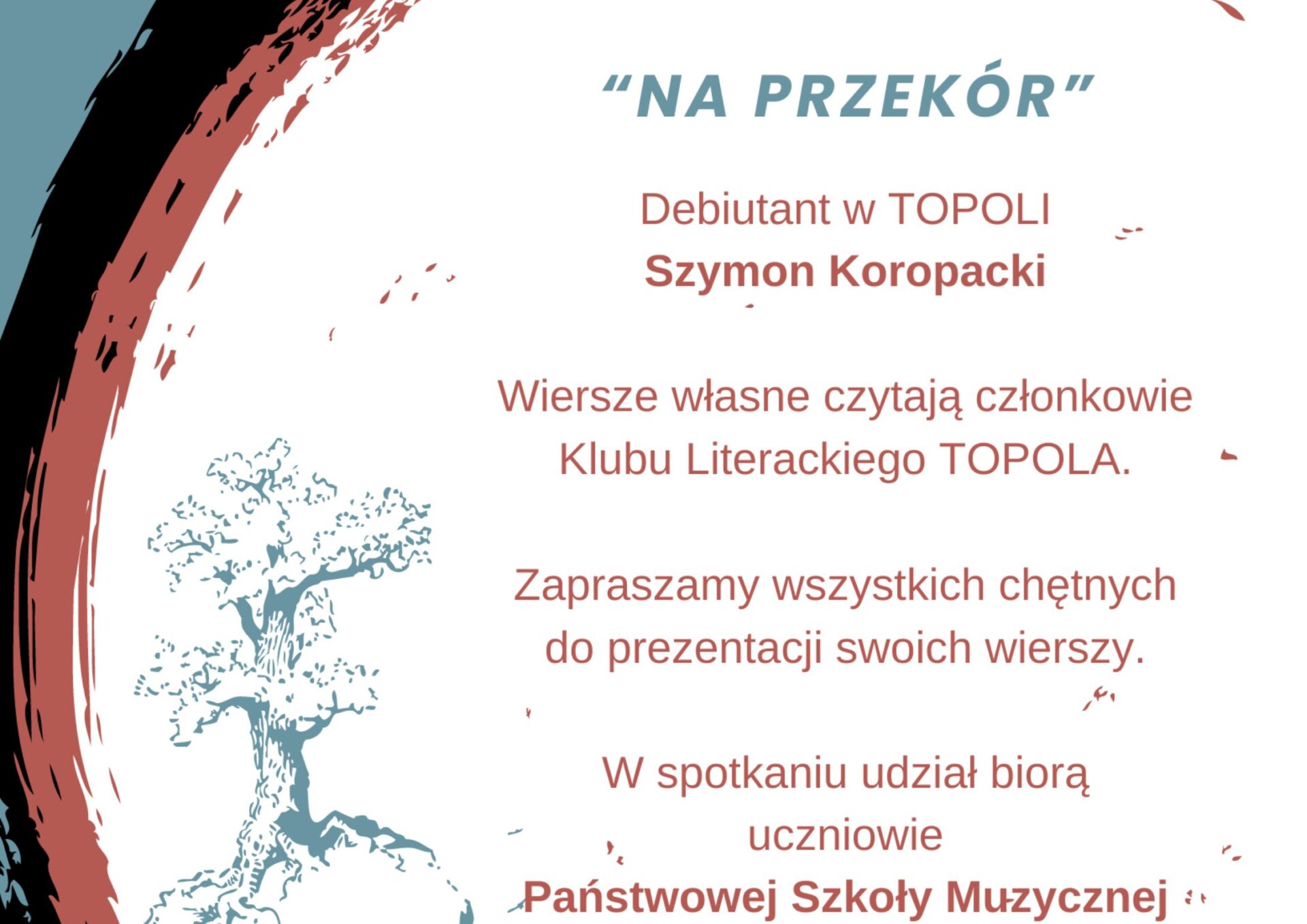 Poezja i poeci dobrze czują się w towarzystwie muzyki. W Kawiarni Literackiej o klimat spotkania „NA PRZEKÓR” zadbają uczniowie Państwowej Szkoły Muzycznej I i II stopnia w Zduńskiej Woli.