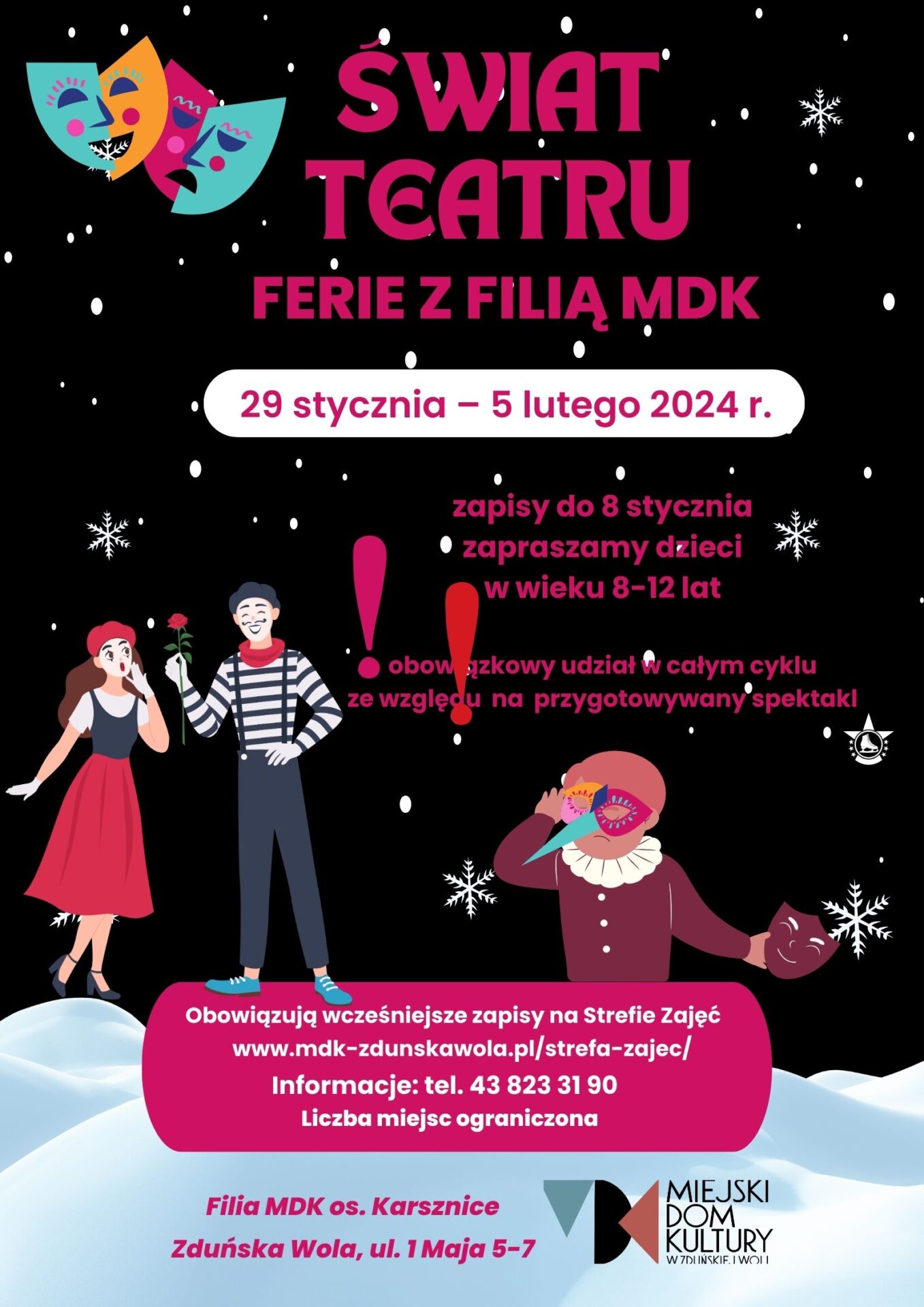 Zapraszamy do udziału w zajęciach feryjnych ,,Świat Teatru”. Będziemy wspólnie ćwiczyć, wygłupiać się, przebierać i robić scenografie.