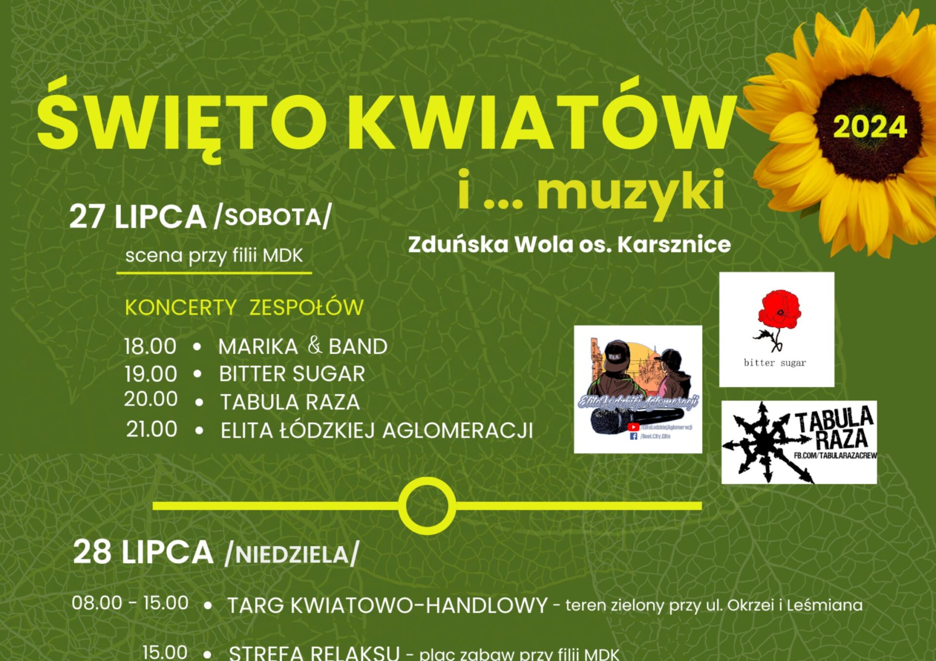 W sobotę, 27 lipca odbędą się koncerty na scenie plenerowej przy filii Miejskiego Domu Kultury. Wystąpią zespoły muzyczne prezentujące różne gatunki muzyczne: Marika & Band, Bitter Sugar, Tabula Raza i Elita Łódzkiej Aglomeracji.