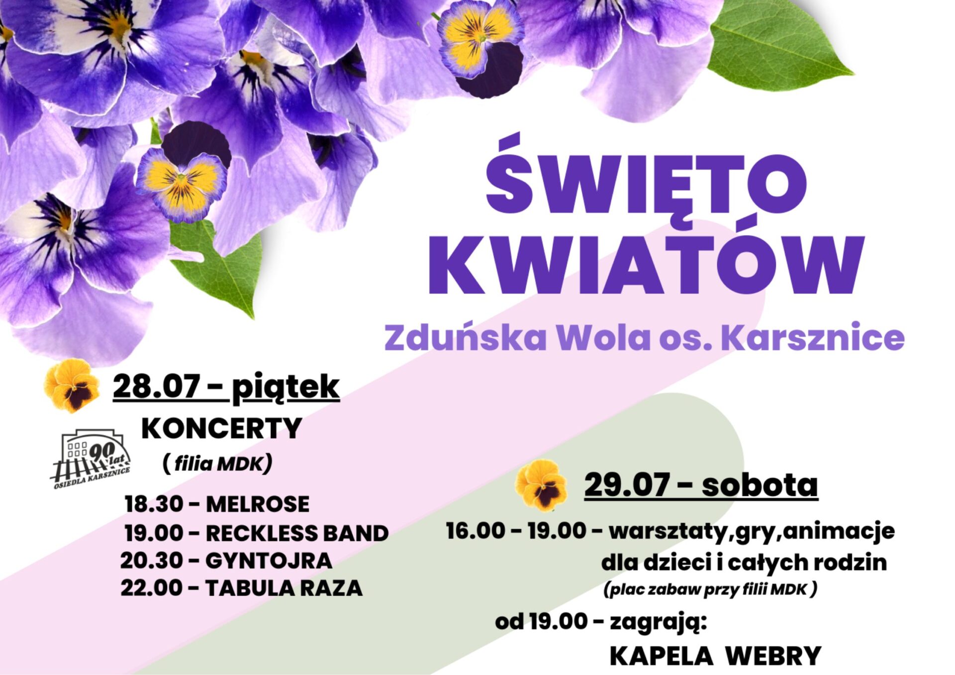 Świętować zaczniemy już wcześniej, w piątek, 28 lipca. W sali widowiskowej filii MDK wystąpią zespoły rockowe: TABULA RAZA, GINTOJRA i RECKLESS BAND oraz MELROSE, zespół trap/rapowy newgenowy. Fanów tego rodzaju muzyki zapraszamy od godz. 19.00. Koncert związany jest z jubileuszem 90-lecia osiedla Karsznice .
