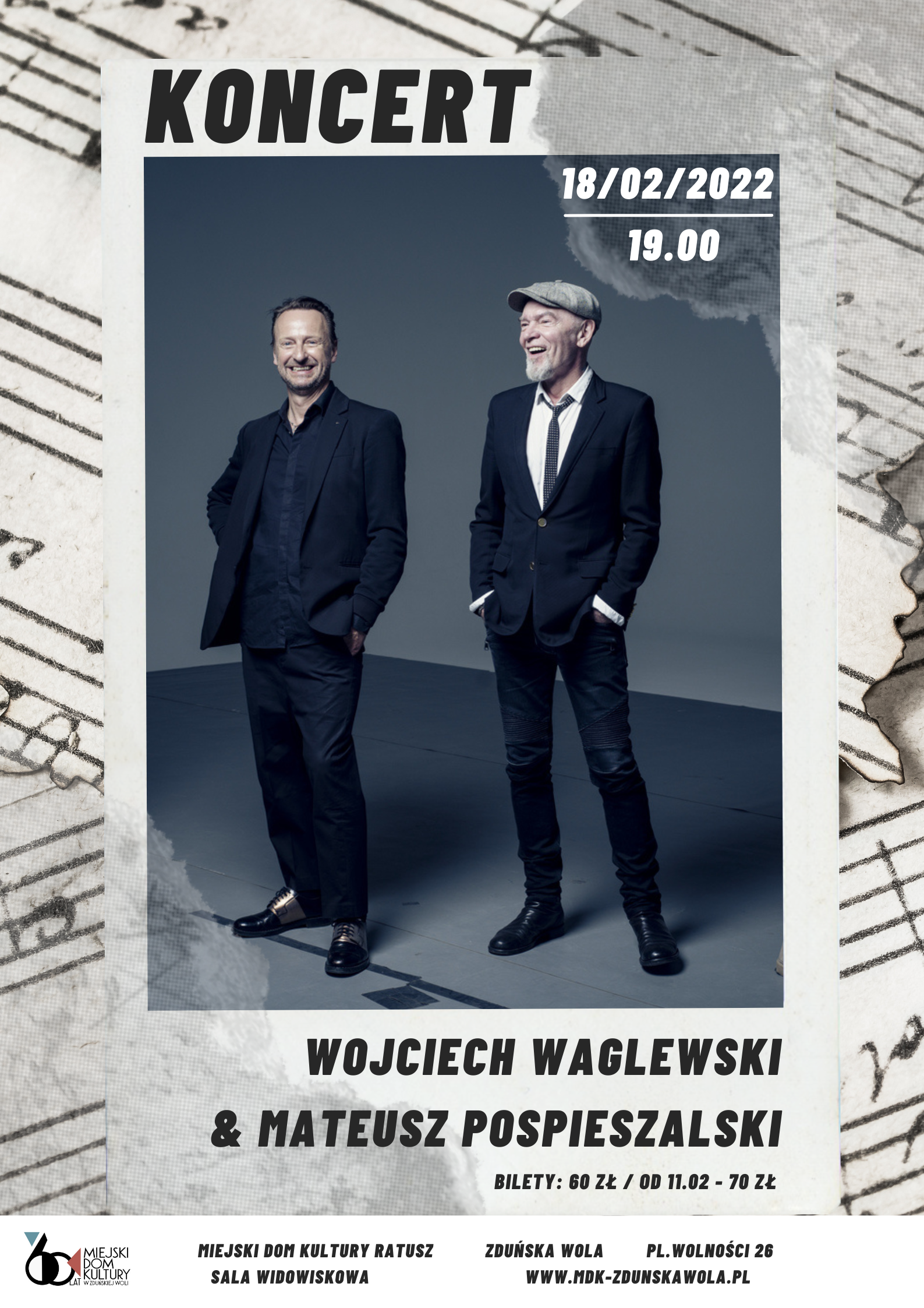 Koncert duetu: Wojciech Waglewski & Mateusz Pospieszalski odbędzie się 18 lutego o godzinie 19.00 w sali widowiskowej w Miejskim Domu Kultury Ratusz, pl. Wolności 26.