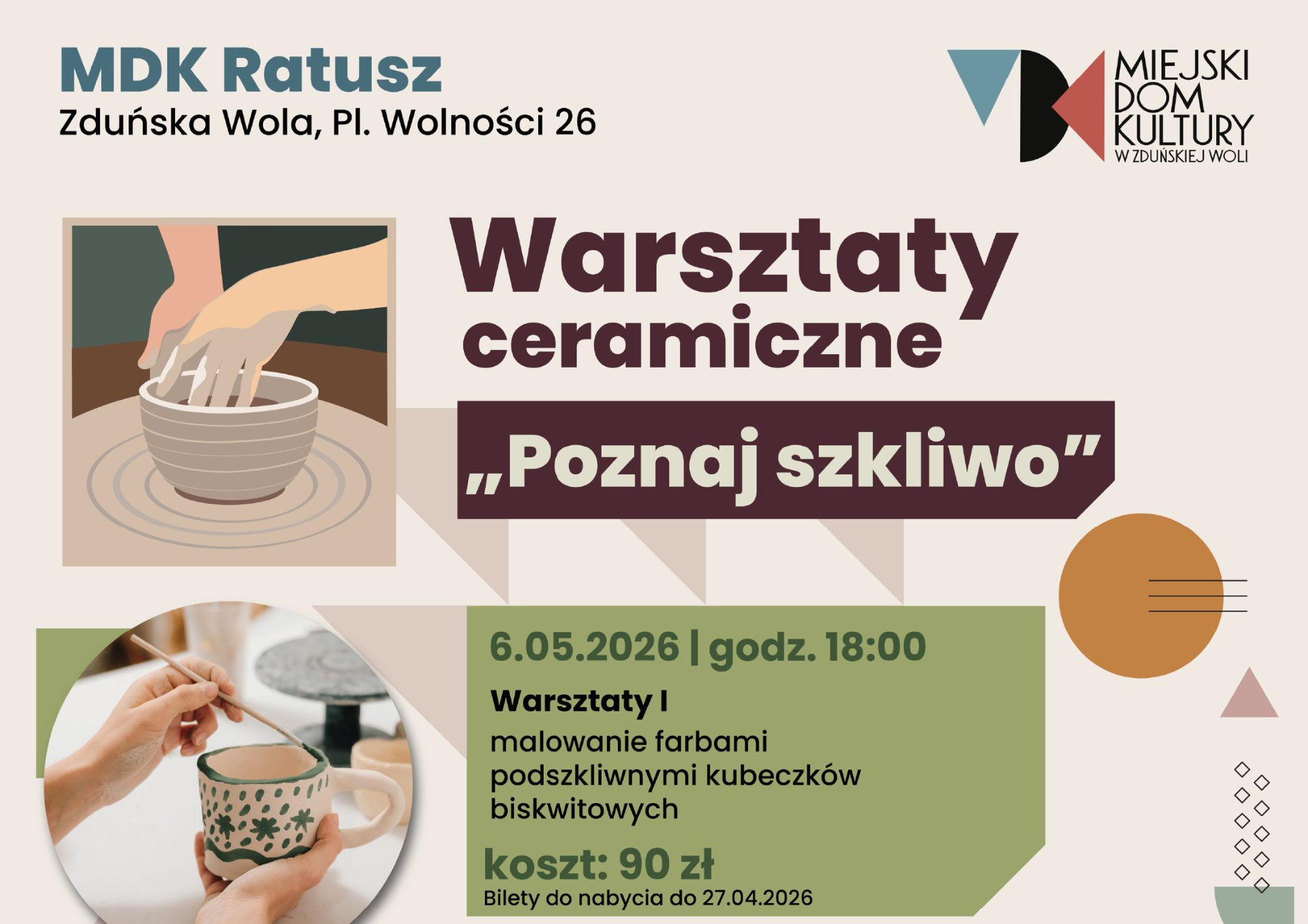 Istnieje możliwość zakupu karnetu na dwa warsztaty z cyklu „Poznaj szkliwo” w promocyjnej cenie 220,00 zł. Karnety do nabycia tylko w kasie MDK do 27.04.2026 r.