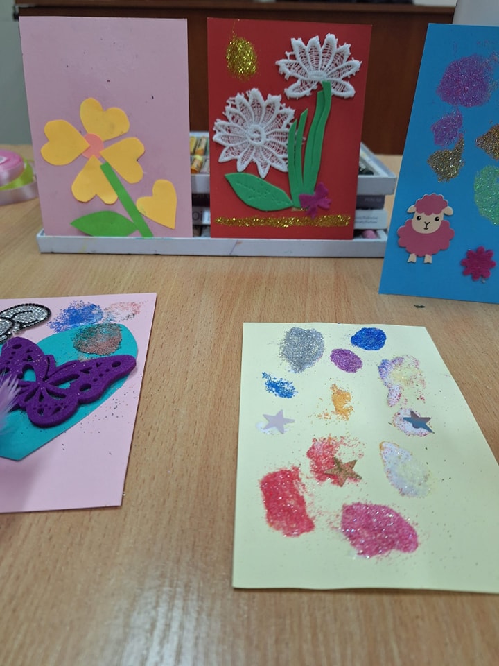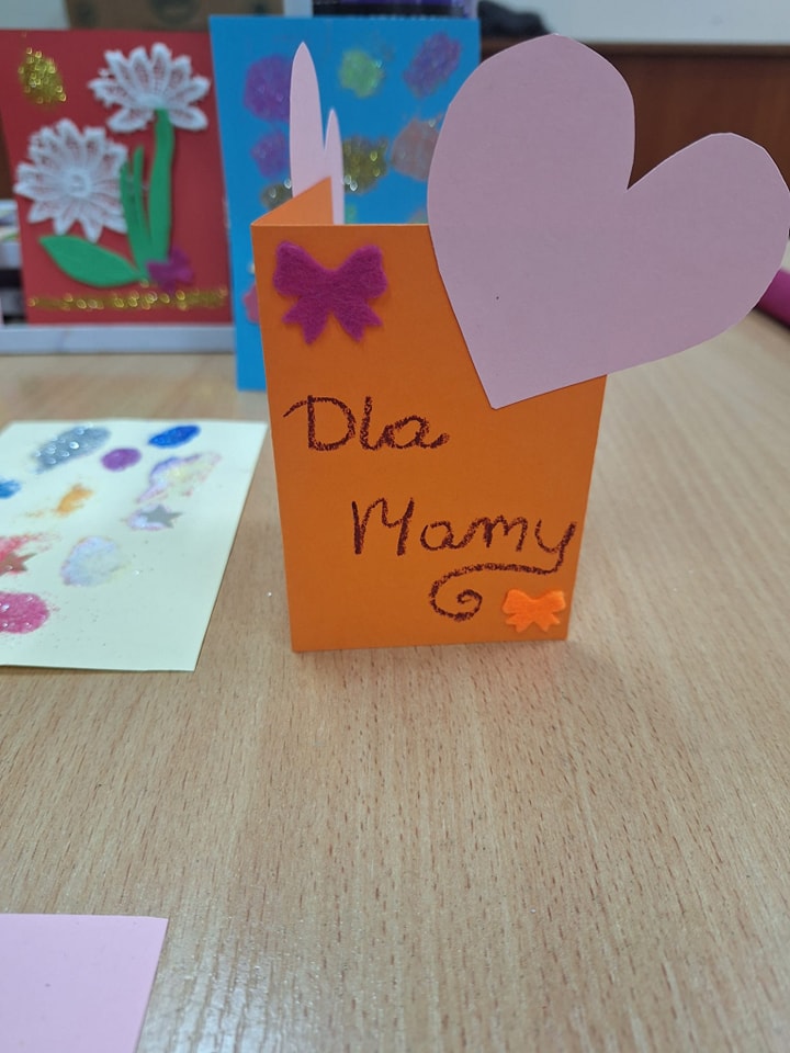 Z kolorowych kartek, kredek, nożyczek, kleju i innych ozdób dzieci samodzielnie stworzyły wyjątkowe upominki dla ukochanych Mam. Powstały pięknie udekorowane laurki, ozdoby, kartki z życzeniami. Wszystkie zostały wykonane z wielkim zaangażowaniem i z miłości do Mamy.