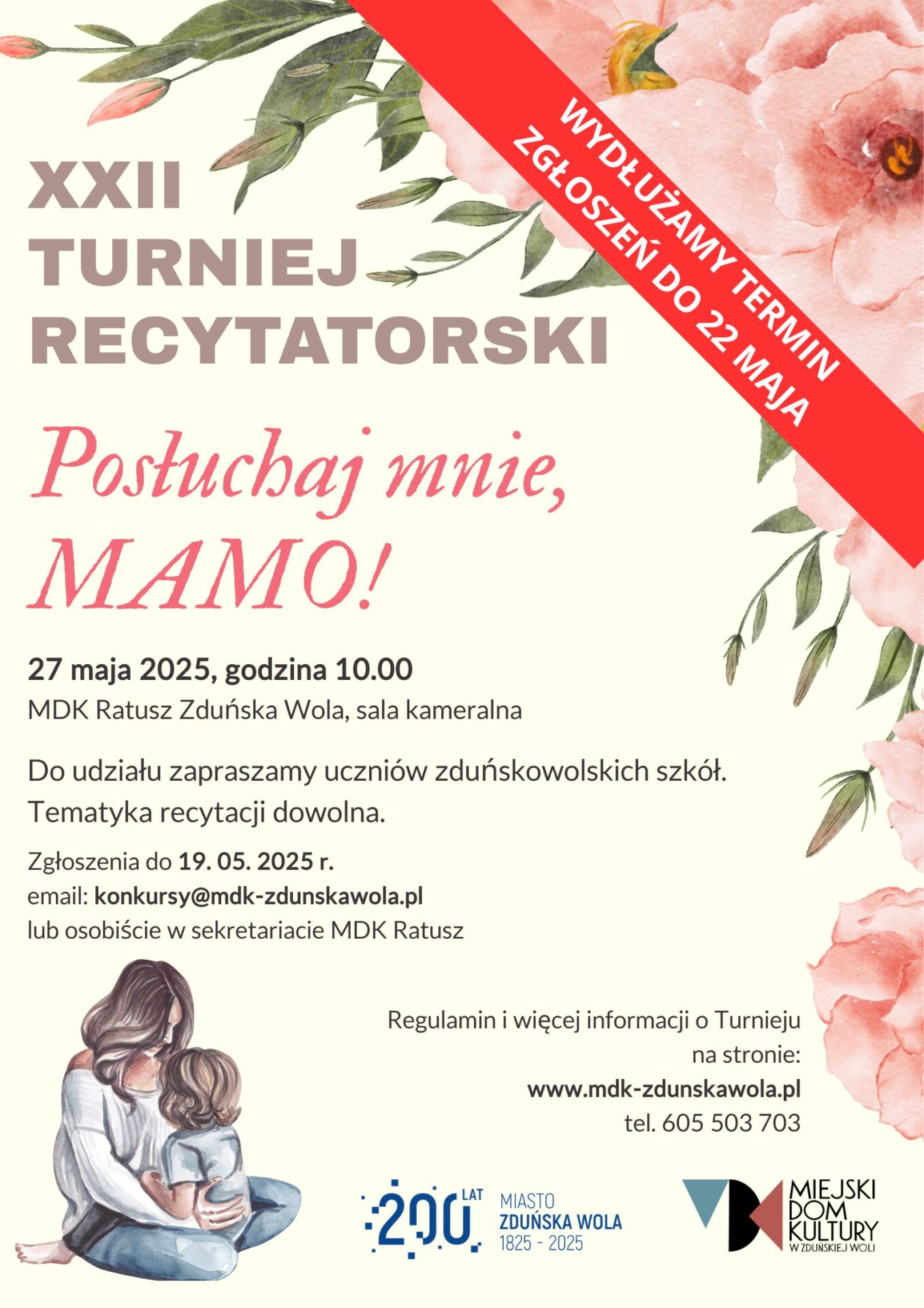 XXII Turniej Recytatorski „ Posłuchaj mnie, Mamo!” odbędzie się 27 maja, o godz. 10:00 w sali kameralnej MDK Ratusz, pl. Wolności 26.