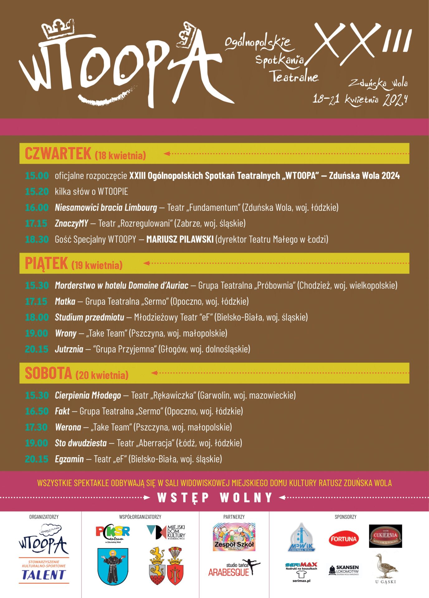 – WTOOPA nie ma formuły konkursowej, co bardzo mocno pragniemy podkreślić, bowiem głównym celem tej imprezy ma być rozwijanie u młodych ludzi ich pasji, jaką jest teatr. Służyć temu mają liczne warsztaty teatralne, prezentacje spektakli, a także wspólne szczere dyskusje. Aby to osiągnąć, istotny jest udział zaproszonych zespołów w całej WTOOPIE, a nie jedynie w dniu prezentacji spektaklu – podkreślają organizatorzy ze Stowarzyszenia WTOOPA.