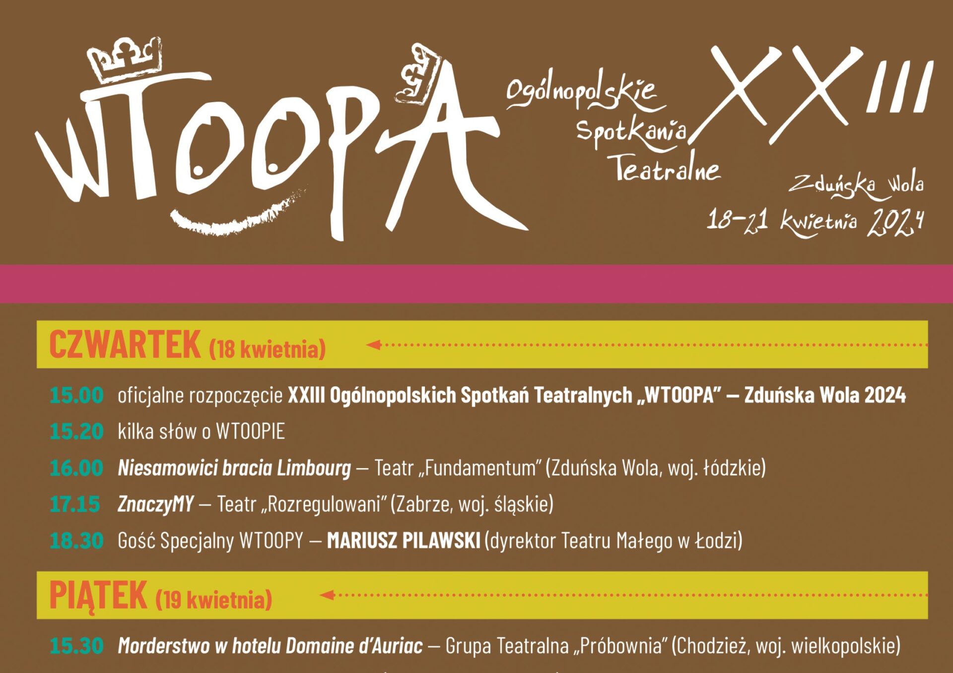 – WTOOPA ma być czasem pracy i radości dla wszystkich, którzy teatr kochają i bez którego ich życie byłoby uboższe. Dlatego właśnie celowo zrezygnowaliśmy z formuły konkursowej, uważamy bowiem, że już samo obcowanie ze sceną, tekstem, rekwizytem i słowem będzie dla wszystkich uczestników największą nagrodą – dodają.